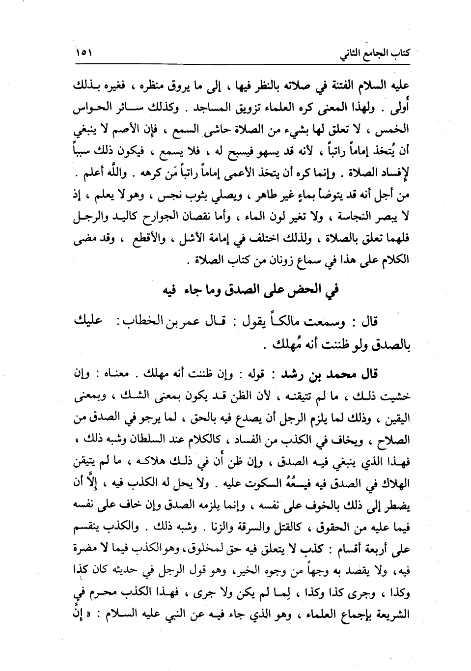 في الحض على الصدق وما جاء فيه قال: وسمعت مالكاً يقول: قال عمر بن الخطاب: عليك بالصدق ولو ظننت أنه مُهلك.
