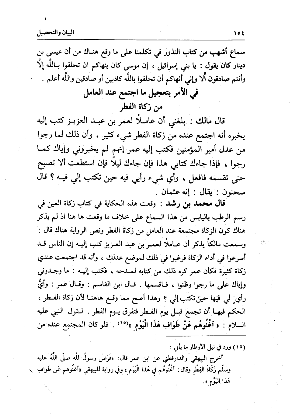 قال محمد بن رشد: وقعت هذه الحكاية في كتاب زكاة العين في رسم الرطب باليابس من هذا السماع على خلاف ما وقعت هاهنا إذ لم يذكر هناك كون الزكاة مجتمعة عند العامل من زكاة الفطر ونص الرواية هناك قال: وسمعت مالكاً يذكر أن عاملاً لعمر بن عبد العزيز كتب إليه إن الناس قد أسرعوا في أداء الزكاة فرغبوا في ذلك لموضع عدلك، وأنه قد اجتمعت عندي زكاة كثيرة فكأن عمر كره ذلك من كتابه لمدحه، فكتب إليه: ما وجدوني وإياك على ما رجوا وظنوا، فاقسمها. قال ابن القاسم: وقال عمر: وأيُّ رأيٍ لي فيها حين تكتب إلي؟ وهذا أصح مما وقع هاهنا لأن زكاة الفطر، الحكم فيها أن تجمع قبل يوم الفطر فتفرق يوم الفطر. لقول النبي - عَلَيْهِ السَّلَامُ -: «أغْنُوهُم عَنْ طَوَافِ هَذَا الْيَوْم» . فلو كان المجتمِع عنده من