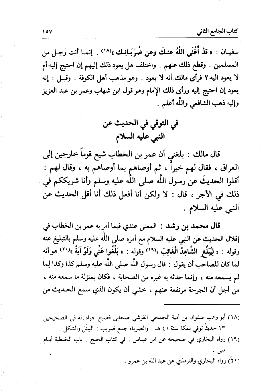النبي - عَلَيْهِ السَّلَامُ - قال مالك: بلغني أن عمر بن الخطاب شيع قوماً خارجين إلى العراق، فقال لهم خيرا، ثم أوصاهم بما أوصاهم به، وقال لهم: أقلوا الحديثَ عن رسول اللَّه - صَلَّى اللَّهُ عَلَيْهِ وَسَلَّمَ - وأنا شريككم في ذلك في الأجر، قال: لا ولكن أنا أفعل ذلك أنا أقل الحديث عن النبي - عَلَيْهِ السَّلَامُ -.