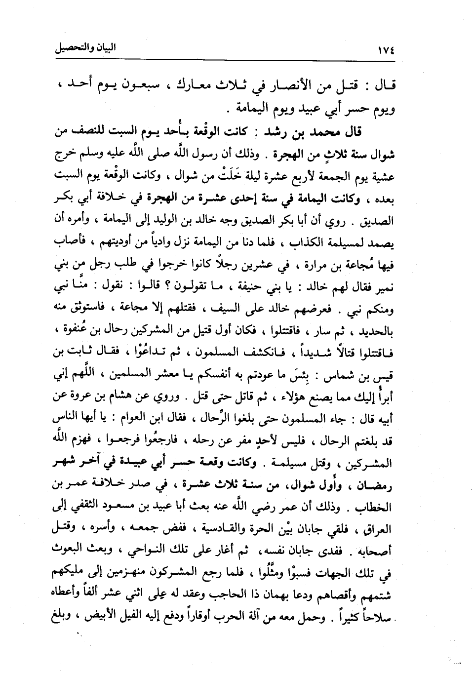 قال محمد بن رشد: كانت الوقْعة بأحد يوم السبت للنصف من شوال سنة ثلاثٍ من الهجرة. وذلك أن رسول اللَّه - صَلَّى اللَّهُ عَلَيْهِ وَسَلَّمَ - خرج عشية يوم الجمعة لأربع عشرة ليلة خَلَتْ من شوال، وكانت الوقْعة يوم السبت بعده، وكانت اليمامة في سنة إحدى عشرة من الهجرة في خلافة أبي بكر الصديق. روي أن أبا بكر الصديق وجه خالد بن الوليد إلى اليمامة، وأمره أن يصمد لمسيلمة الكذاب، فلما دنا من اليمامة نزل وادياً من أوديتهم، فأصاب فيها مُجاعة بن مرارة، في عشرين رجلاً كانوا خرجوا في طلب رجل من بني نمير فقال لهم خالد: يا بني حنيفة، ما تقولون؟ قالوا: نقول: منَّا نبي ومنكم نبي. فعرضهم خالد على السيف، فقتلهم إلا مجاعة، فاستوثق منه بالحديد، ثم سار، فاقتتلوا، فكان أول قتيل من المشركين رحال بن عُنفوة، فاقتتلوا قتالاً شديداً، فانكشف المسلمون، ثم تداعوا، فقال ثابت بن قيس بن شماس: بِئسَ ما عودتم به أنفسكم يا معشر المسلمين، اللَّهم إني أبرا إليك مما يصنع هؤلاء، ثم قاتل حتى قتل.