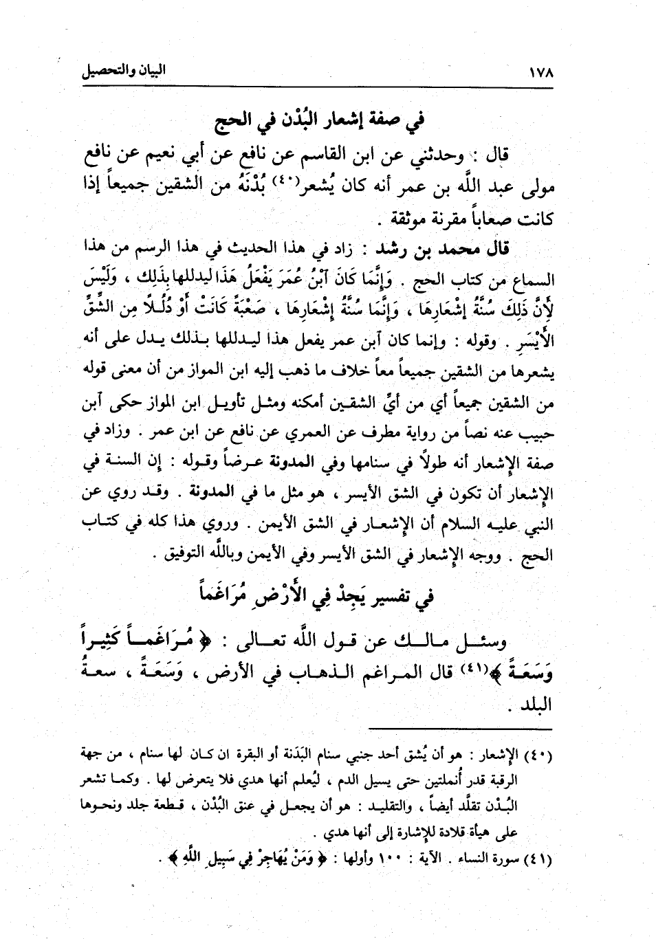 قال محمد بن رشد: زاد في هذا الحديث في هذا الرسم من هذا السماع من كتاب الحج. وَإِنًمَا كَانَ ابنُ عُمَرَ يَفْعَلُ هَذَا ليدللها بِذَلِك، وَلَيْسَ لأنَّ ذَلِكَ سُنَةُ إشْعَارِهَا، وَإِنَّمَا سُنةُ إِشْعَارِهَا، صَعْبَةً كَانَتْ أو دُلُلًا مِن الشَق الأيْسَرِ. وقوله: وإنما كان ابن عمر يفعل هذا ليدللها بذلك يدل على أنه يشعرها من الشقين جميعاً معاً خلاف ما ذهب إليه ابن المواز من أن معنى قوله من الشقين جميعاً أي من أيَ الشقين أمكنه ومثل تأويل ابن المواز حكى ابن حبيب عنه نصاً من رواية مطرف عن العمري عن نافع عن ابن عمر. وزاد في صفة الإِشعار أنه طولًا في سنامها وفي المدونة عرضاً وقوله: إِن السنة في الإِشعار أن تكون في الشق الأيسر، هو مثل ما في المدونة. وقد روي عن النبي - عَلَيْهِ السَّلَامُ - أن الإِشعار في الشق الأيمن. وروي هذا كله في كتاب الحج. ووجه الإِشعار في الشق الأيسر وفي الأيمن وباللَه التوفيق.