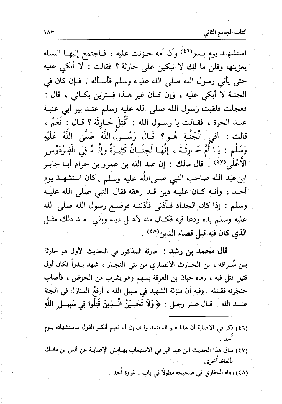 استشهد يوم بدرٍ وأن أمه حزنت عليه، فاجتمع إليها النساء يعزينها وقلن ما لك لا تبكين على حارثة؟ فقالت: لا أبكي عليه حتى يأتي رسول الله - صَلَّى اللَّهُ عَلَيْهِ وَسَلَّمَ - فأسأله، فإن كان في الجنة لا أبكي عليه، وإن كان غير هذا فسترين بكائي، قال: فعجلت فلقيت رسول الله - صَلَّى اللَّهُ عَلَيْهِ وَسَلَّمَ - عند بير أبي عنبة عند الحرة، فقالت: يا رسول الله: أَقُتِلَ حَارِثَة؟ قال: نَعَمْ، قالت: أفي الْجَنَّةِ هُو؟ قَالَ رَسُولُ اللَّهَ - صَلَّى اللَّهُ عَلَيْهِ وَسَلَّمَ -: يَا أمَّ حَارِثَةَ، إنَّهَا لَجِنَانٌ كَثِيرَةٌ وإنَّهُ فِي الْفِرْدَوْس الأعْلَى.» قال مالك: «إن عبد الله بن عمرو بن حرام أبا جابر بن عبد الله صاحب النبي - صَلَّى اللَّهُ عَلَيْهِ وَسَلَّمَ -، كان استشهد يوم أحد، وأنه كان عليه دين قد رهقه فقال النبي - صَلَّى اللَّهُ عَلَيْهِ وَسَلَّمَ -: إذا كان الجداد فآذني فأَذنته فوضع رسول الله - صَلَّى اللَّهُ عَلَيْهِ وَسَلَّمَ - يده ودعا فيه فكال منه لأهل دينه وبقي بعد ذلك مثل الذي كان فيه قبل قضاء الدين» .