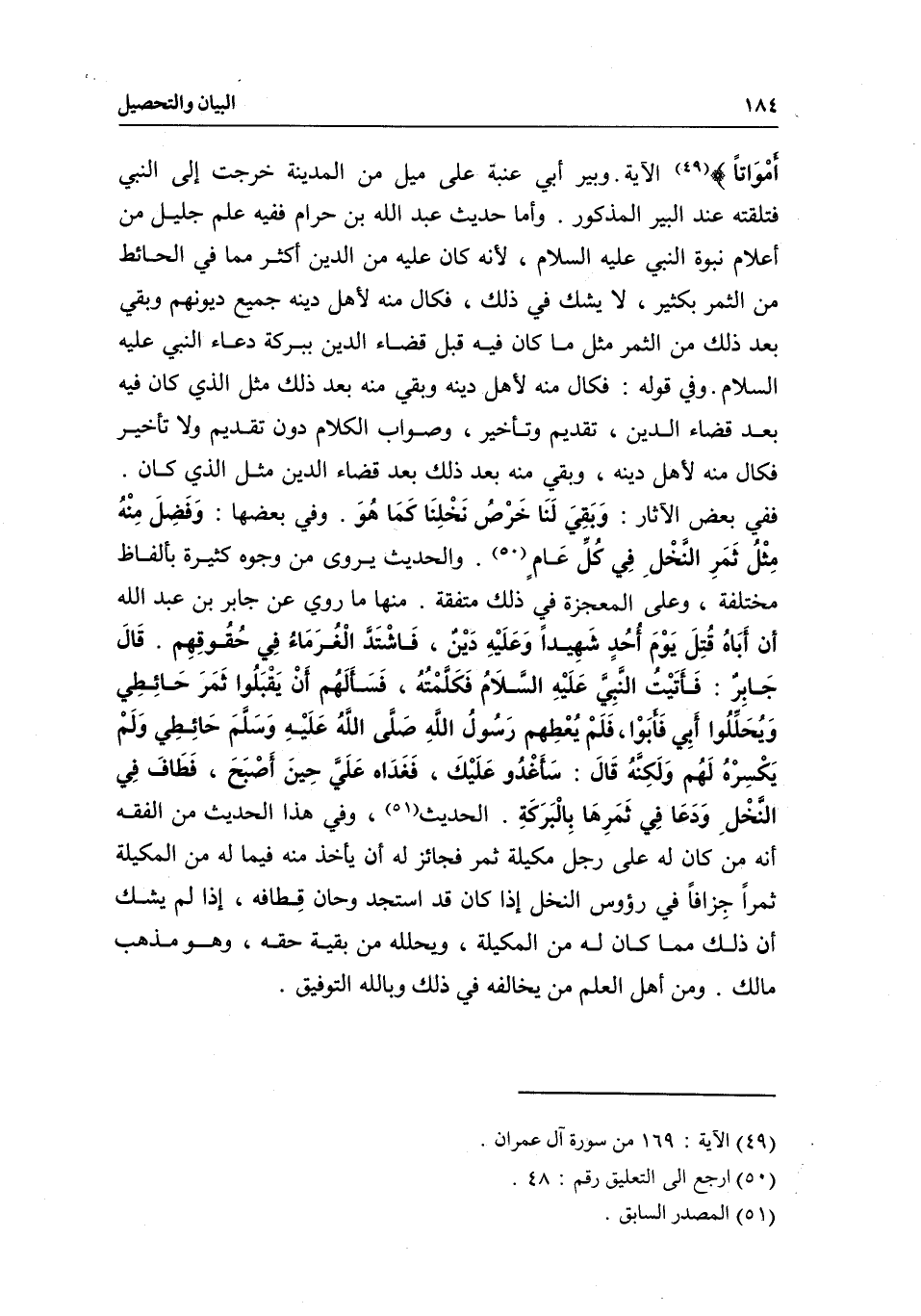 الآية. وبير أبي عنبة على ميل من المدينة خرجت إلى النبي فتلقته عند البير المذكور. وأما حديث عبد الله بن حرام ففيه علم جليل من أعلام نبوة النبي - عَلَيْهِ السَّلَامُ -، لأنه كان عليه من الدين أكثر مما في الحائط من الثمر بكثير، لا يشك في ذلك، فكال منه لأهل دينه جميع ديونهم وبقي بعد ذلك من الثمر مثل ما كان فيه قبل قضاء الدين ببركة دعاء النبي - عَلَيْهِ السَّلَامُ -. وفي قوله: فكال منه لأهل دينه وبقي منه بعد ذلك مثل الذي كان فيه بعد قضاء الدين، تقديم وتأخير، وصواب الكلام دون تقديم ولا تأخير فكال منه لأهل دينه، وبقي منه بعد ذلك بعد قضاء الدين مثل الذي كان.