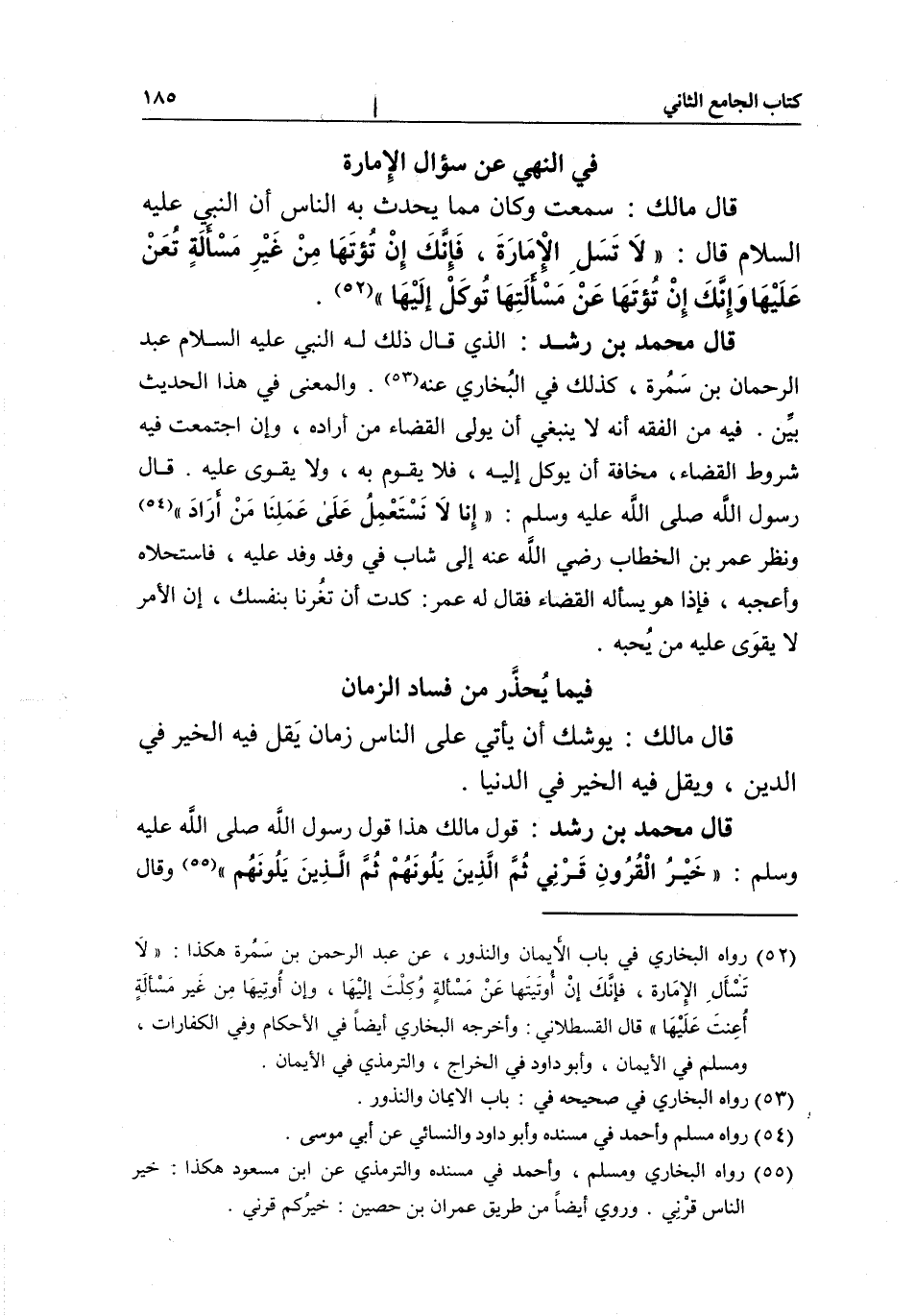 في النهي عن سؤال الِإمارة قال مالك: سمعت وكان مما يحدث به الناس أن النبي - عَلَيْهِ السَّلَامُ - قال: «لَا تَسَل الْإمَارَةَ، فَإِنَّكَ إِنْ تُؤتَهَا مِنْ غَيْرِ مَسْأَلَةٍ تعَنْ عَلَيْهَا وَإِنَّكَ إِنْ تُؤتَهَا عَنْ مَسألَتِهَا تُوكَلْ إلَيْهَا» .