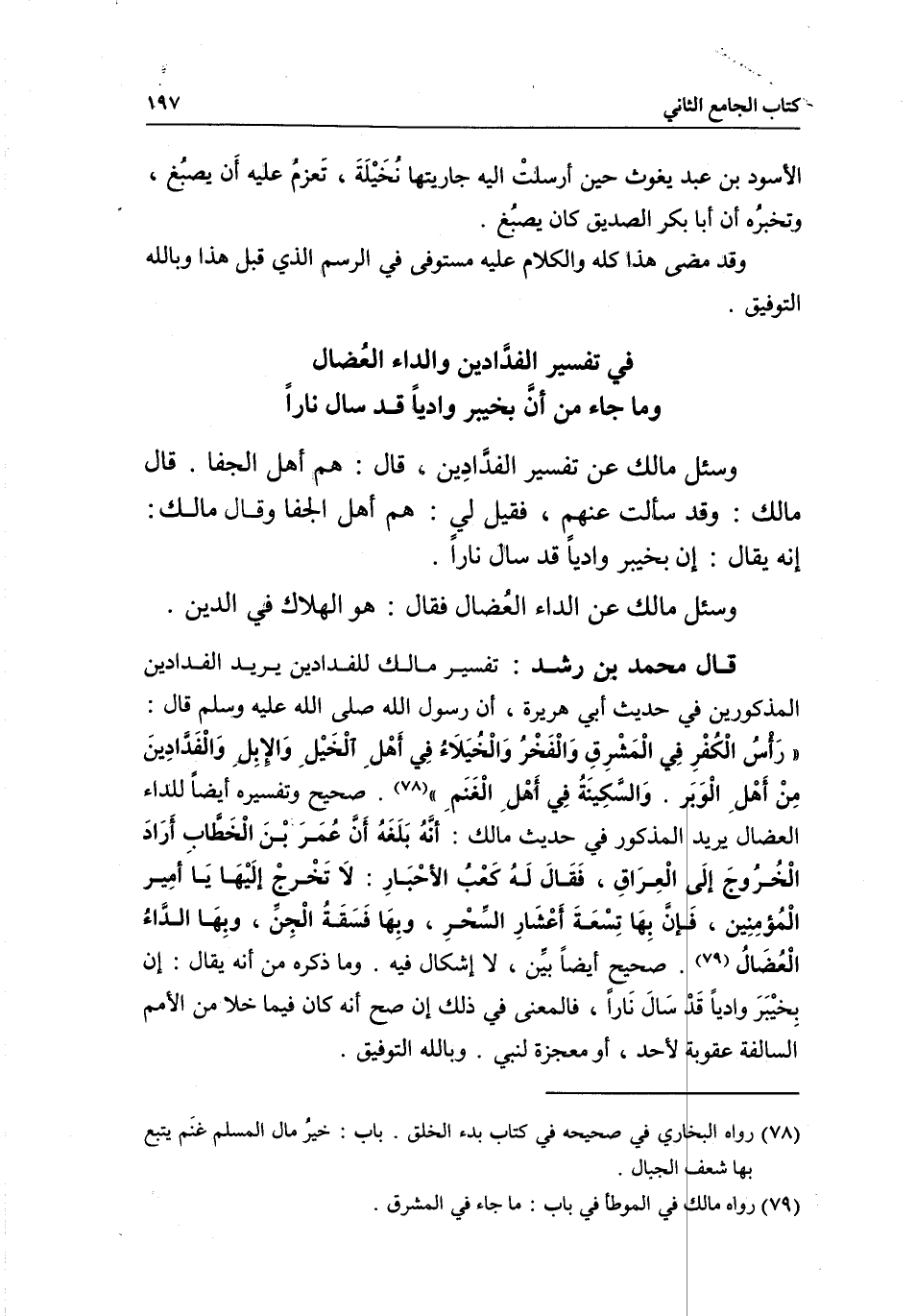 في تفسير الفَدادين والداء العًضال وما جاء من أن بخيبر وادياً قد سال ناراً وسئل مالك عن تفسير الفدَّادِين قال: هم أهل الجفا. قال مالك: وقد سألت عنهمِ، فقيل ليِ: هم أهل الجفا وقال مالك: إنه يقال: إن بخيبر وادياَ قد سال ناراَ.