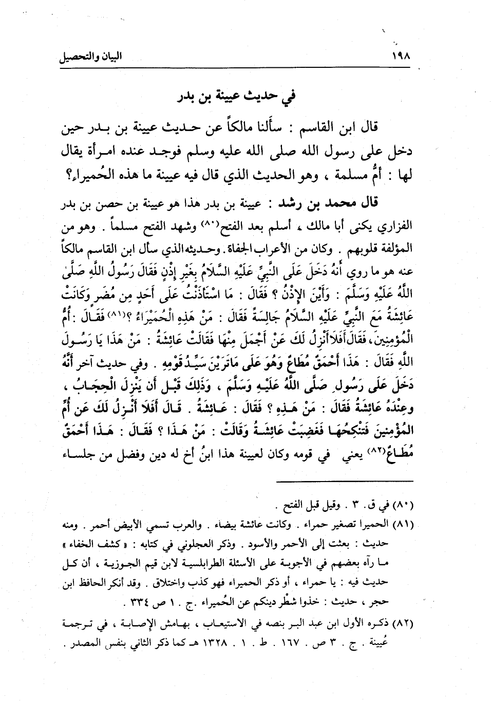 في حديث عيينة بن بدر قال ابن القاسم: سأَلنا مالكاً عن حديث عيينة بن بدر حين دخل على رسول الله - صَلَّى اللَّهُ عَلَيْهِ وَسَلَّمَ - فوجد عنده امرأة يقال لها: أمُّ مسلمة، وهو الحديث الذي قال فيه عيينة ما هذه الحُميراء؟