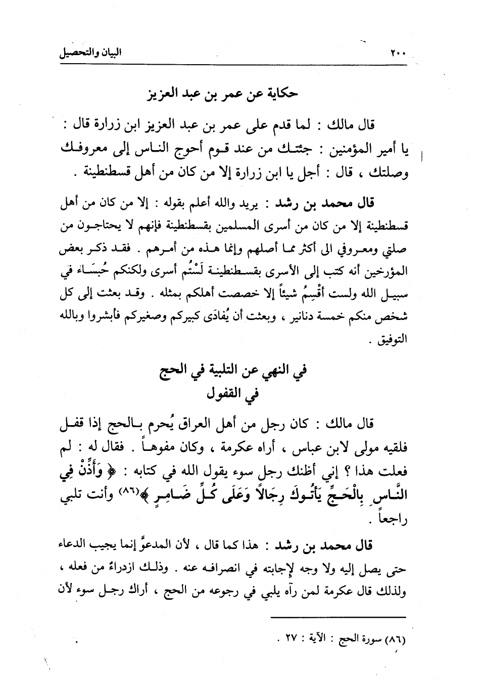 في القفول قال مالك: كان رجل من أهل العراق يُحرم بالحج إذا قفل فلقيه مولى لابن عباس، أراه عكرمة، وكان مفوهاً. فقال له: لم فعلت هذا؟ إني أظنك رجلِ سوء يقول الله في كتابه: {وَأَذِّنْ فِي النَّاسِ بِالْحَجِّ يَأْتُوكَ رِجَالا وَعَلَى كُلِّ ضَامِرٍ} [الحج: 27] وأنت تلبي راجعا.