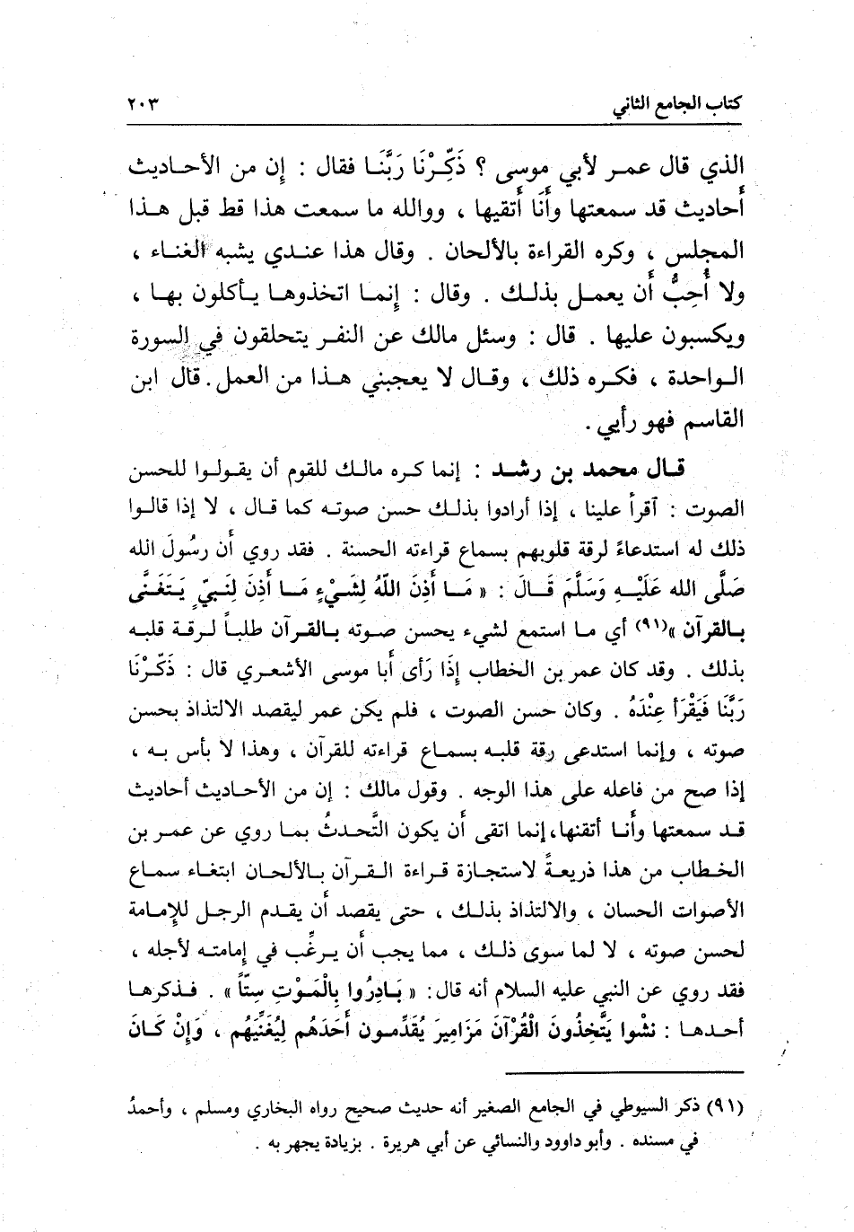 وقد كان عمر بن الخطاب إِذَا رَأى أبا موسى الأشعري قال: ذَكّرْنَا رَبَّنَا فَيَقْرَأ عِنْدَهُ. وكان حسن الصوت، فلم يكن عمر ليقصد الالتذاذ بحسن صوته، وإنما استدعى رقة قلبه بسماع قراءته للقرآن، وهذا لا بأس به، إذا صح من فاعله على هذا الوجه. وقول مالك: إن من الأحاديث أحاديث قد سمعتها وأنا أتقنها، إنما اتقى أن يكون التَّحدثُ بما روي عن عمر بن الخطاب من هذا ذريعةً لاستجازة قراءة القرآن بالألحان ابتغاء سماع الأصوات الحسان، والالتذاذ بذلك، حتى يقصد أن يقدم الرجل للِإمامة لحسن صوته، لا لما سوى ذلك، مما يجب أن يرغِّب في إِمامته لأجله، فقد روي عن النبي - عَلَيْهِ السَّلَامُ - أنه قال: «بَادِرُوا بِالْمَوْتِ سِتّاً» . فذكرها أحدها: «نشْوا يَتَّخِذُونَ الْقُرْآنَ مَزَامِيرَ يُقَدِّمون أحَدَهُم لِيُغَنِّيَهُم، وَإِنْ كَانَ