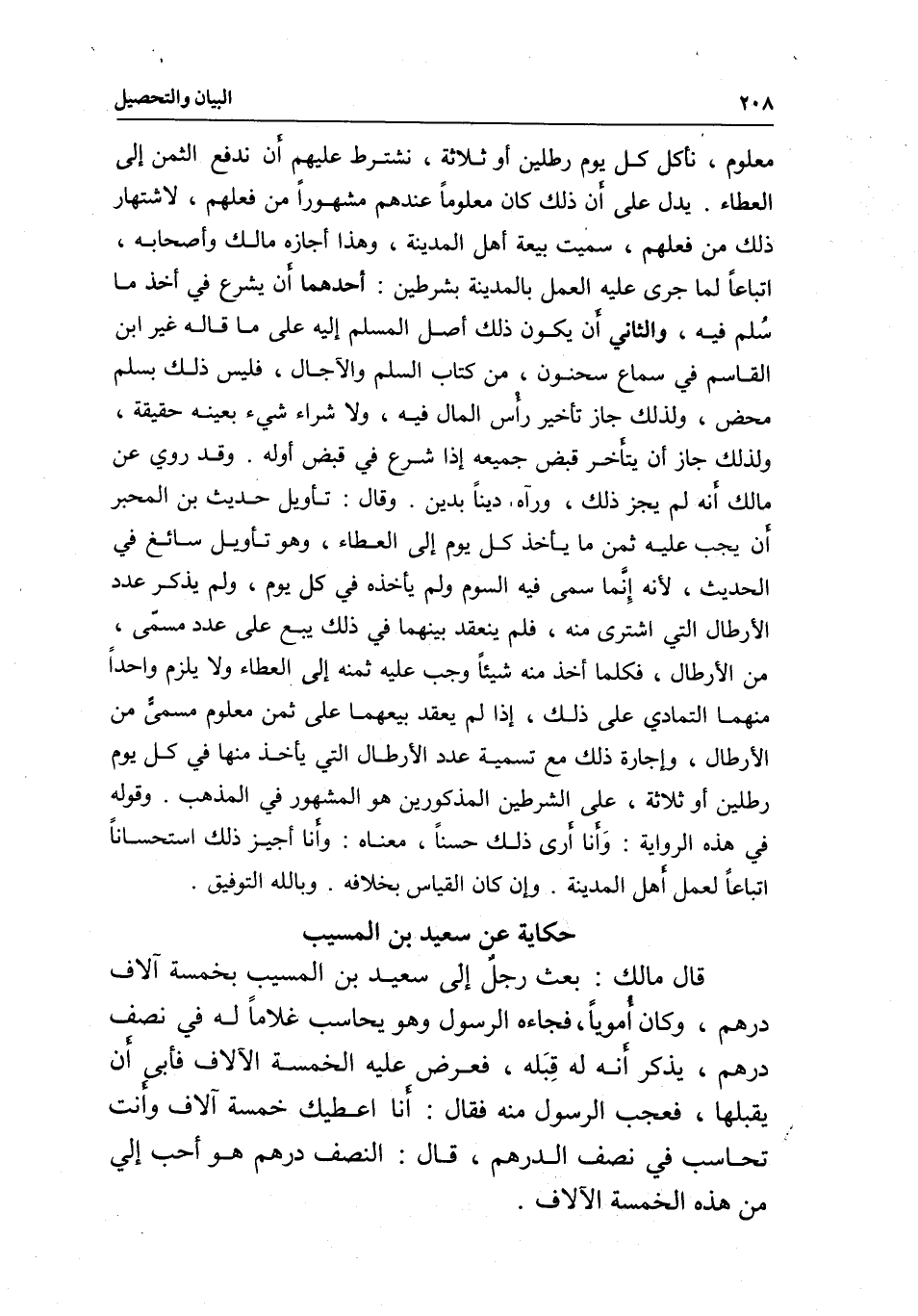 معلوم، نأكل كل يوم رطلين أو ثلاثة، نشترط عليهمِ أن ندفع الثمن إلى العطاء. يدل على أن ذلك كان معلوماً عندهم مشهوراَ من فعلهم، لاشتهار ذلك من فعلهم، سميت بيعة أهل المدينة، وهذا أجازه مالك وأصحابه، اتباعاً لما جرى عليه العمل بالمدينة بشرطين: أحدهما أن يشرع في أخذ ما سُلم فيه، والثاني أن يكون ذلك أصل المسلم إليه على ما قاله غير ابن القاسم في سماع سحنون، من كتاب السلم والآجال، فليس ذلك بسلم محض، ولذلك جاز تأخير رأْس المال فيه، ولا شراء شيء بعينه حقيقة، ولذلك جاز أن يتأخر قبض جميعه إذا شرع في قبض أوله.