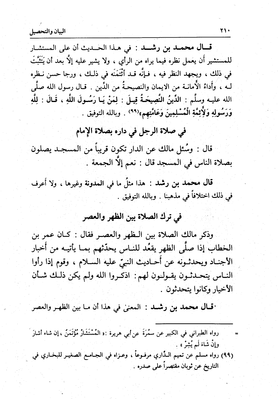 قال محمد بن رشد: في هذا الحديث أن على المستشار للمستشير أَن يعمل نظره فيما يراه من الرأي، ولا يشير عليه إلاَّ بعد أن يَتثَبَّتَ في ذلك، ويجهد النظر فيه، فإنًه قد ائْتَمَنَه في ذلك، ورجا حسن نظره له، وأَداءُ الأمانة من الإيمان والنصيحةُ من الدِّين. قال رسول الله - صَلَّى اللَّهُ عَلَيْهِ وَسَلَّمَ -: «الدِّينُ النَّصِيحَةُ قِيلَ: لِمَنْ يَا رَسُولَ اللَّهِ، قَالَ: لِلّهِ وَرَسُولِهِ وَلِأئمَّةِ المُسْلِمِينَ وَعَامَّتِهِم» . وبالله التوفيق.