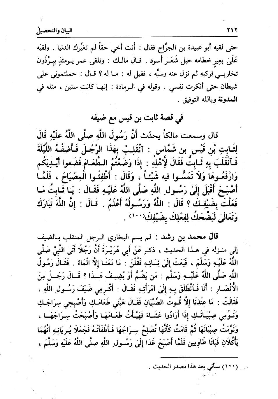 قال: وسمعت مالكاً يحدّث «أَنَّ رَسُولَ اللهِ صَلَّى اللَّهُ عَلَيْهِ قَالَ لِثَابِتِ بْن قَيْس بن شَمَّاس: انقَّلِبْ بِهَذَا الرِّجُلَ فَأَضفْهُ اللَّيْلَةَ فَانْقَلَبَ بِهِ ثَابِت فَقَالَ لَأهْلهَ: إِذا وَضَعْتُمُ الطَّعَامَ فَضَعوا أَيْدِيَكُم وَارْفَعُوهَا وَلَا تَمَسّوا فيه شَيْئَاَ، وَقَالَ: أَطْفِئُوا الْمِصْبَاحَ، فَلَمَّا أَصْبَحَ أَقْبَلَ إِلَى رسول الله صَلَّى اللَّهُ عَلَيْهِ فقَالَ: يا ثَابِتُ مَا فَعَلْتَ بِضَيْفِكَ؟ قَالَ: اللَّهُ وَرَسولهُ أَعْلَمُ. قَالَ: إِنَّ اللَّهَ تَبَارَكَ وَتَعَالَى لَيَضْحَكُ لِفِعْلِكَ بِضَيْفِكَ» .