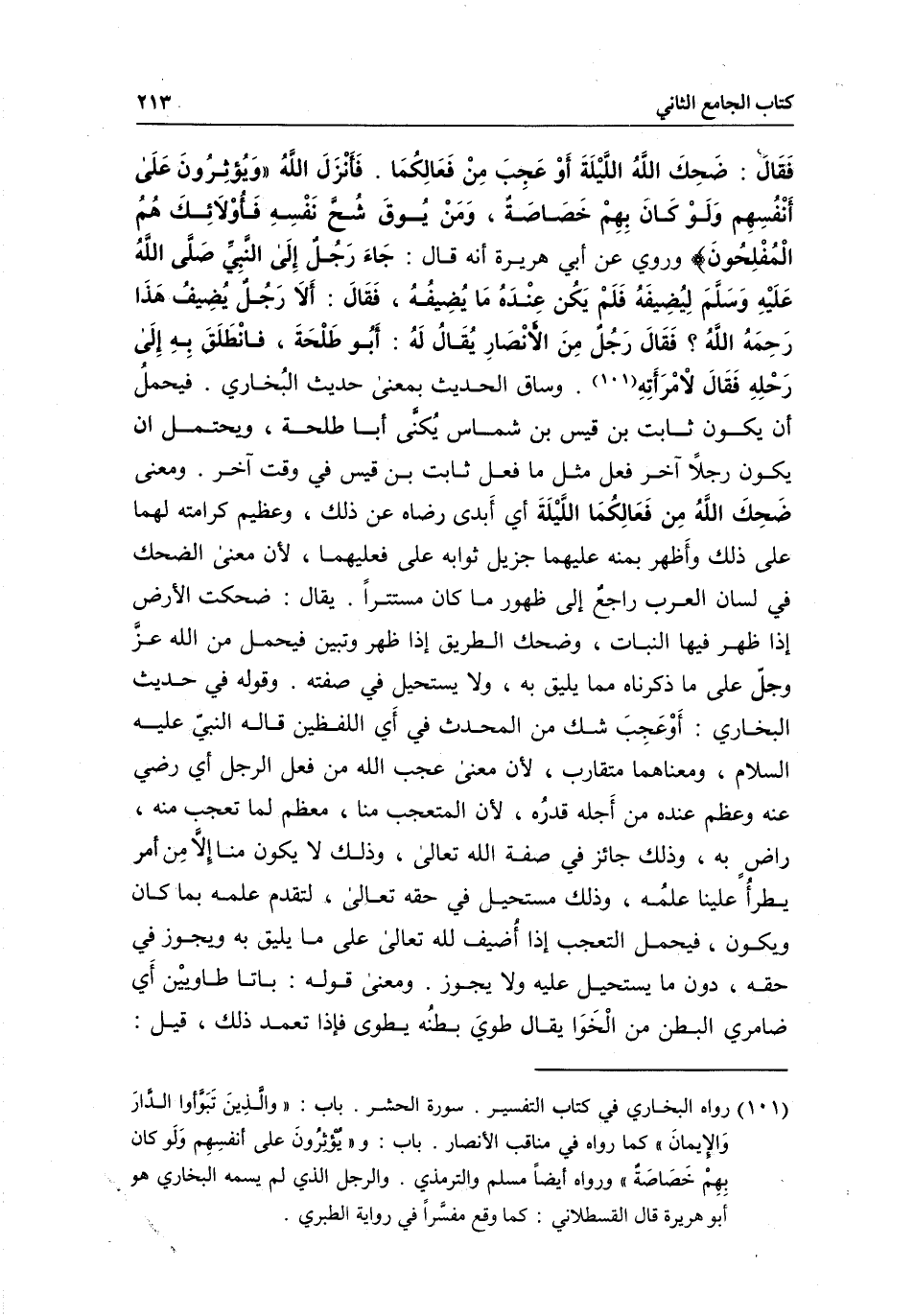 فَقَالَ: ضَحِكَ اللَّهُ اللَّيْلَةَ أَوْ عَجِبَ مِنْ فَعَالِكُمَا. فَأَنْزَلَ اللَّهُ {وَيُؤْثِرُونَ عَلَى أَنْفُسِهِمْ وَلَوْ كَانَ بِهِمْ خَصَاصَةٌ وَمَنْ يُوقَ شُحَّ نَفْسِهِ فَأُولَئِكَ هُمُ الْمُفْلِحُونَ} [الحشر: 9] » وروي عن أبي هريرة أنه قال: «جَاءَ رَجُلٌ إِلَى النَّبِيِّ - صَلَّى اللَّهُ عَلَيْهِ وَسَلَّمَ - لِيُضِيفَهُ فَلَْم يَكُن عِنْدَهُ مَا يُضِيفهْ، فَقَالَ: أَلَا رَجُلٌ يُضِيفُ هَذَا - رَحِمَهُ اللَّهُ -؟ فَقَالَ رَجُل مِنَ الأنْصَارِ يُقَالُ لَهُ: أَبُو طَلْحَةَ، فانْطَلَقَ بِهِ إِلَى رَحْلِهِ فَقَالَ لْامْرَأَتِهِ» . وساق الحديث بمعنى حديث البُخاري. فيحملُ أن يكون ثابت بن قيس بن شماس يُكنَى أبا طلحة، ويحتمل أن يكون رجلاً آخر فعل مثل ما فعل ثابت بن قيس في وقت آخر. ومعنى ضَحِكَ اللَّهً مِن فَعَالِكُمَا اللَّيْلَةَ أي أَبدى رضاه عن ذلك، وعظيم كرامته لهما على ذلك وأَظهر بمنه عليهما جزيل ثوابه على فعليهما، لأن معنى الضحك في لسان العرب راجع إلى ظهور ما كان مستتراً. يقال: ضحكت الأرض إذا ظهر فيها النبات، وضحك الطريق إذا ظهر وتبين فيحمل من الله عزَّ وجلّ على ما ذكرناه مما يليق به، ولا يستحيل في صفته. وقوله في حديث البخاري: أَوْ عَجِبَ شك من المحدث في أَي اللفظين قاله النبيّ عليه السلام، ومعناهما متقارب، لأن معنى عجب الله من فعل الرجل أي رضي عنه وعظم عنده من أَجله قدرُه، لأن المتعجب منا، معظم لما تعجب منه، راضٍ به، وذلك جائز في صفة الله تعالى، وذلك لا يكون منا إِلّاَ مِن أمر يطرأُ علينا علمُه، وذلك مستحيل في حقه تعالى، لتقدم علمه بما كان ويكون، فيحمل التعجب إذا أُضيف لله تعالى على ما يليق به ويجوز في حقه، دون ما يستحيل عليه ولا يجوز. ومعنى قوله: باتا طاوييْن أَي ضامري البطن من الْخَوَا يقال طويَ بطنُه يطوى فإذا تعمد ذلك، قيل: