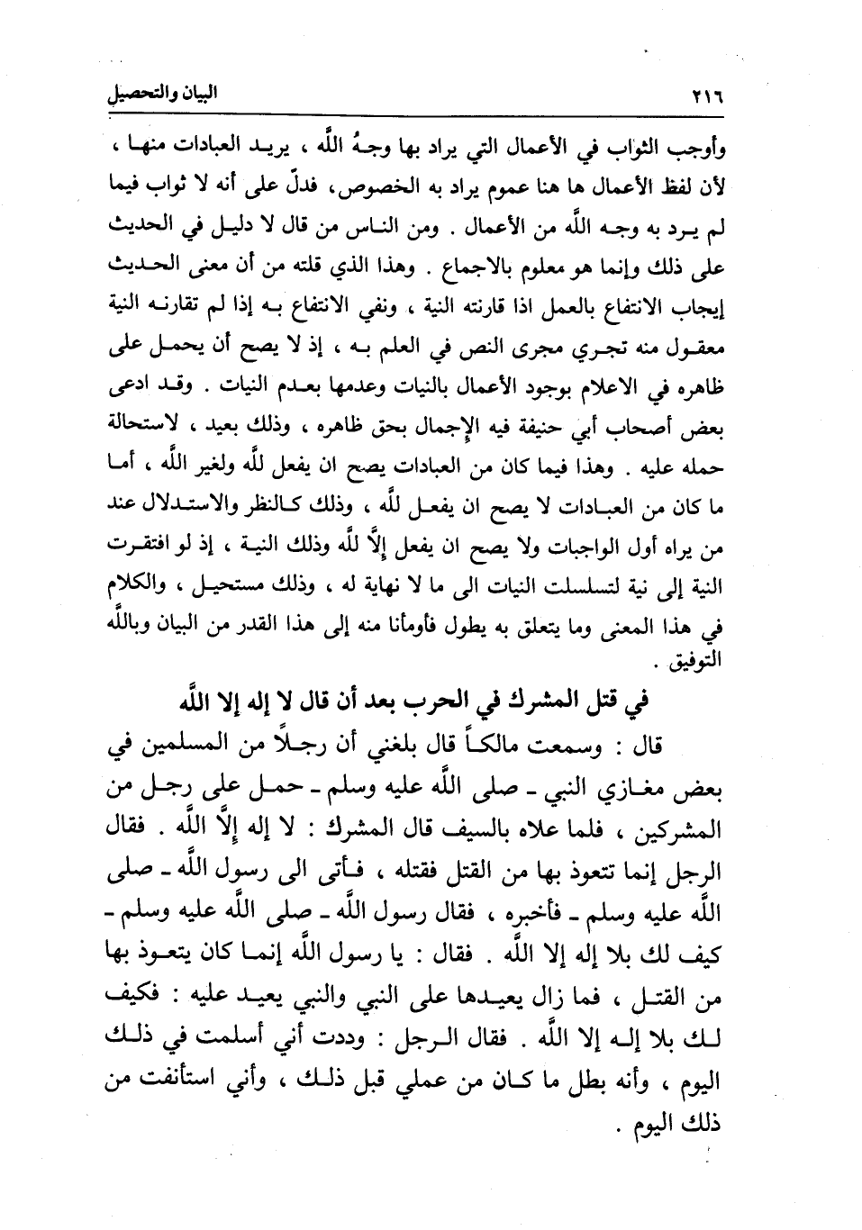في قتل المشرك في الحرب بعد أن قال لا إله إلا اللَّه قال: وسمعت مالكاً قال: بلغني «أن رجلًا من المسلمين في بعض مغازي النبي - صَلَّى اللَّهُ عَلَيْهِ وَسَلَّمَ - حمل على رجل من المشركين، فلما علاه بالسيف قال المشرك: لا إله إِلَّا اللَّه. فقال الرجل: إنما تتعوذ بها من القتل فقتله، فأتى إلى رسول اللَّه - صَلَّى اللَّهُ عَلَيْهِ وَسَلَّمَ - فأخبره، فقال رسول اللَّه - صَلَّى اللَّهُ عَلَيْهِ وَسَلَّمَ - كيف لك بلا إله إلا اللَّه. فقال: يا رسول اللَّه إنما كان يتعوذ بها من القتل، فما زال يعيدها على النبي والنبي يعيد عليه: فكيف لك بلا إله إلا اللَّه. فقال الرجل: وددت أني أسلمت في ذلك اليوم، وأنه بطل ما كان من عملي قبل ذلك، وأني استأنفت من ذلك اليوم» .