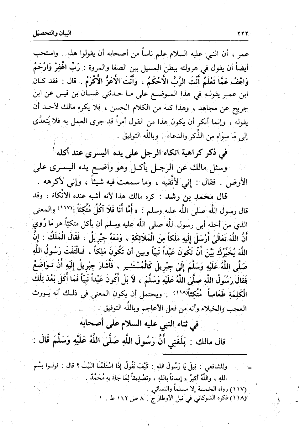 في ذكر كراهية اتكاء الرجل على يده اليسرى عند أكله وسئل مالك عن الرجل يأكل وهو واضعِ يده اليسرى على الأرض. فقال: إِني لأتَّقيه، وما سمعت فيه شيئاَ، وإني لأكرهه.