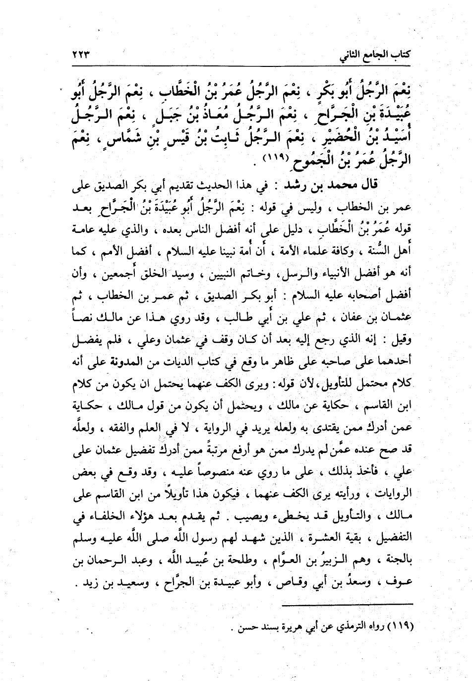 قال محمد بن رشد: في هذا الحديث تقديم أبي بكر الصديق على عمر بن الخطاب، وليس في قوله: نِعْمَ الرَجُلُ أبو عُبَيْدَةَ بْنُ الْجرَّاح بعد قوله عُمَرُ بْنُ الْخَطَّابِ، دليل على أنه أفضل الناس بعده، والذي عليه عامة أهل السنة، وكافة علماء الأمة، أن أمة نبينا - عَلَيْهِ السَّلَامُ -، أفضل الأمم، كما أنه هو أفضل الأنبياء والرسل، وخاتم النبيين، وسيد الخلق أجمعين، وأَن أفضل أصحابه - عَلَيْهِ السَّلَامُ -: أبو بكر الصديق، ثم عمر بن الخطاب، ثمِ عثمان بن عفان، ثم علي بن أبي طالب، وقد روي هذا عن مالك نصاَ وقيل: إنه الذي رجع إليه بعد أن كان وقف في عثمان وعلي، فلم يفضل أحدهما على صاحبه على ظاهر ما وقع في كتاب الديات من المدونة على أنه كلام محتمل للتأويل، لأن قوله: ويرى الكف عنهما يحتمل أن يكون من كلام ابن القاسم، حكاية عن مالك، ويحتمل أن يكون من قول مالك، حكاية عمن أدرك ممن يقتدي به ولعله يريد في الرواية، لا في العلم والفقه، ولعلَّه قد صح عنده عمَّن لم يدرك ممن هو أرفع مرتبةً ممن أدرك تفضيل عثمان على علي، فأخذ بذلك، على ما روي عنه منصوصاً عليه، وقد وقع في بعض الروايات، ورأيته يرى الكف عنهما، فيكون هذا تأويلاً من ابن القاسم على مالك، والتأويل قد يخطئ ويصيب. ثم يقدم بعد هؤلاء الخلفاء في التفضيل، بقية العشرة، الذين شهد لهم رسول اللًه - صَلَّى اللَّهُ عَلَيْهِ وَسَلَّمَ - بالجنة، وهم الزبيرُ بن العوَّام، وطلحة بن عُبيد اللَّه، وعبد الرحمن بن عوف، وسعدُ بن أبي وقاص، وأبو عبيدة بن الجرَّاح، وسعيد بن زيد.