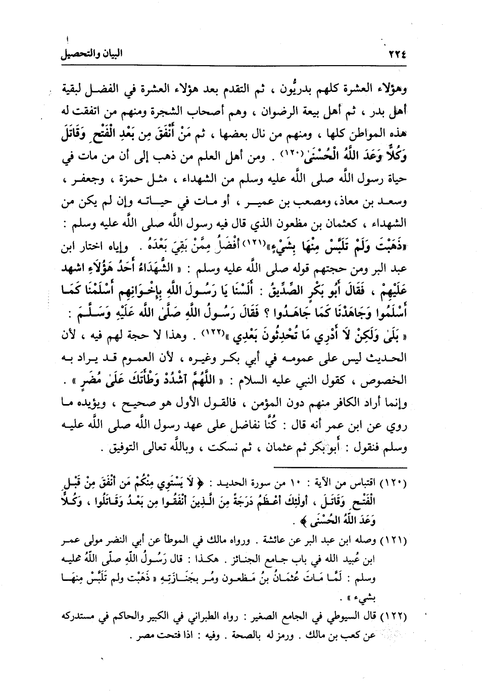 وهؤلاء العشرة كلهم بدريُون، ثم التقدم بعد هؤلاء العشرة في الفضل لبقية أهل بدر، ثم أهل بيعة الرضوان، وهم أصحاب الشجرة ومنهم من اتفقت له هذه المواطن كلها، ومنهم من نال بعضها، ثم مَنْ أنْفَقَ مِن بَعْدِ الْفَتح وَقَاتَلَ وَكُلاًّ وَعَدَ اللَّهُ الْحُسْنَى ومن أهل العلم من ذهب إلى أن من مات في حياة رسول اللَّه - صَلَّى اللَّهُ عَلَيْهِ وَسَلَّمَ - من الشهداء، مثل حمزة، وجعفر، وسعد بن معاذ، ومصعب بن عمير، أو مات في حياته وإن لم يكن من الشهداء، كعثمان بن مظعوّن الذي قال فيه رسول اللًه - صَلَّى اللَّهُ عَلَيْهِ وَسَلَّمَ -: «ذَهَبْتَ وَلَمْ تَلبَّسْ مِنهَا بِشَيْءٍ» أفْضَل مِمَّنْ بَقِيَ بَعْدهُ. وإياه اختار ابن عبد البر ومن حجتهم قوله - صَلَّى اللَّهُ عَلَيْهِ وَسَلَّمَ -: «الشَهَدَاءُ أحَدُ هَؤُلَاءِ اشهد عَلَيْهِمْ، فَقَالَ أبُو بَكْرٍ الصدَيقُ: ألَسْنَا يَا رَسُولَ اللَّهِ بِإِخْوَانِهِم أسْلَمْنَا كَمَا أسْلَموا وَجاهَدْنَا كَمَا جَاهَدُوا؟ فَقَال رَسُولُ اللَّهِ - صَلَّى اللَّهُ عَلَيْهِ وَسَلَّمَ -: " بَلَى وَلَكِنْ لَا أدرِي ما تُحْدثونَ بَعْدِي» . وهذا لا حجة لهم فيه، لأن الحديث ليس على عمومه في أبي بكر وغيره، لأن العموم قد يراد به الخصوص، كقول النبي - عَلَيْهِ السَّلَامُ -: «اللَّهُمَّ أشْدُدْ وَطْأتَكَ عَلَى مُضَرٍ» . وإنما أراد الكافر منهم دون المؤمن، فالقول الأول هو الصحيح، ويؤيده ما روي عن ابن عمر أنه قال: كُنَّا نفاضل على عهد رسول اللَّه - صَلَّى اللَّهُ عَلَيْهِ وَسَلَّمَ - فنقول: أبو بكر ثم عثمان، ثم نسكَت، وباللَّه تعالى التوفيق.
