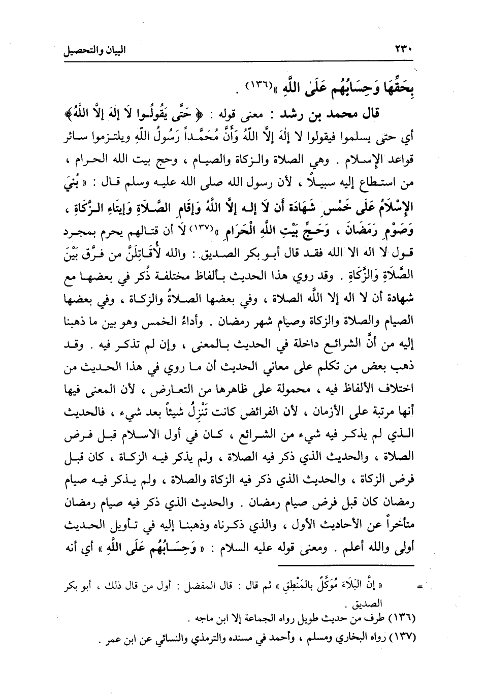 قال محمد بن رشد: معنى قوله: " حَتَّى يَقُولُوا لَا إلهَ إلَّا اللَّهُ " أي حتى يسلموا فيقولوا لا إلهَ إلّاَ اللهُ وَأَنَّ مُحَمَّداً رَسُولُ اللهِ ويلتزموا سائر قواعد الِإسلام. وهي الصلاة والزكاة والصيام، وحج بيت الله الحرام، من استطاع إليه سبيلاً، لأن رسول الله - صَلَّى اللَّهُ عَلَيْهِ وَسَلَّمَ - قال: «بُنيَ الِإسْلَامُ عَلَى خَمْس شَهَادَة أَن لَا إله إلاَّ الله وَإقَام الصَّلاَةِ وَإيتَاءِ الزَّكَاةِ، وَصَوْم رَمَضَانَ، وَحَجِّ بَيْتِ اللِّهِ الْحَرَام» لَا أن قتالهم يحرم بمجرد قول لا اله إلا الله فقد قال أبو بكر الصديق: والله لأقَاتِلَنَّ من فرَّق بَيْنَ الصَلاَةِ وَالزَّكَاةِ. وقد روي هذا الحديث بألفاظ مختلفة ذُكر في بعضها مع شهادة أن لا اله إلا اللَّه الصلاة، وفي بعضها الصلاةُ والزكاة، وفي بعضها الصيام والصلاة والزكاة وصيام شهر رمضان. وأداءُ الخمس وهو بين ما ذهبنا إليه من أنَّ الشرائع داخلة في الحديث بالمعنى، وإن لم تذكر فيه. وقد ذهب بعض من تكلم على معاني الحديث أن ما روي في هذا الحديث من اختلاف الألفاظ فيه، محمولة على ظاهرها من التعارض، لأن المعنى فيها أنها مرتبة على الأزمان، لأن الفرائض كانت تَنْزِلُ شيئاً بعد شيء، فالحديث الذي لم يذكر فيه شيء من الشرائع، كان في أول الإسلام قبل فرض الصلاة، والحديث الذي ذكر فيه الصلاة، ولم يذكر فيه الزكاة، كان قبل فرض الزكاة، والحديث الذي ذكر فيه الزكاة والصلاة، ولم يذكر فيه صيام رمضان كان قبل فرض صيام رمضان. والحديث الذي ذكر فيه صيام رمضان متأخراً عن الأحاديث الأول، والذي ذكرناه وذهبنا إليه في تأويل الحديث أولى والله أعلم. ومعنى قوله - عَلَيْهِ السَّلَامُ -: " وَحِسَابُهُم عَلَى اللَّهِ " أي أنه