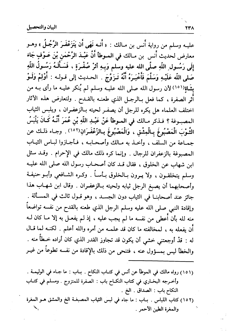 عليه وسلم من رواية أنس بن مالك: «أنه نَهَى أن يَتَزَعْفَرَ الرَّجُلُ» وهو معارض لحديث أنس بن مالك في الموطأ أنَّ عَبْدَ الرَّحْمنِ بْنَ عَوْفٍ جَاءَ إِلَى رَسُول اللهِ - صَلَّى اللَّهُ عَلَيْهِ وَسَلَّمَ - وَبِهِ أثرْ صُفْرَةٍ، فَسَألَهُ رَسُولُ اللهِ - صَلَّى اللَّهُ عَلَيْهِ وَسَلَّمَ - فَأخْبَرَهُ أنَّهُ تَزَوَّجَ. الحديث إلى قوله: أوْلِمْ وَلَوْ بشَاةٍ لأن رسول الله - صَلَّى اللَّهُ عَلَيْهِ وَسَلَّمَ - لم يُنكر عليه ما رأى به من أثر الصفرة، كما فعل بالرجل الذي طعنه بالقدح. ولتعارض هذه الآثار اختلف العلماء هل يكره للرجل أن يصفر لحيته بالزعفران، ويلبس الثياب المصبوغة؟ فذكر مالك في الموطأ عَنْ عَبْدِ اللهِ بْنِ عُمَرَ أنَّهُ كَانَ يَلْبَسُ الثَّوْبَ الْمَصْبُوغَ بِالْمِشْقِ، وَالْمَصْبُوغَ بالزّعْفَرَانِ. وجاء ذلك عن جماعة من السلف، وأخذ به مالك وأصحابه، فأجازوا لباس الثياب المصبوغة بالزعفران للرجال.