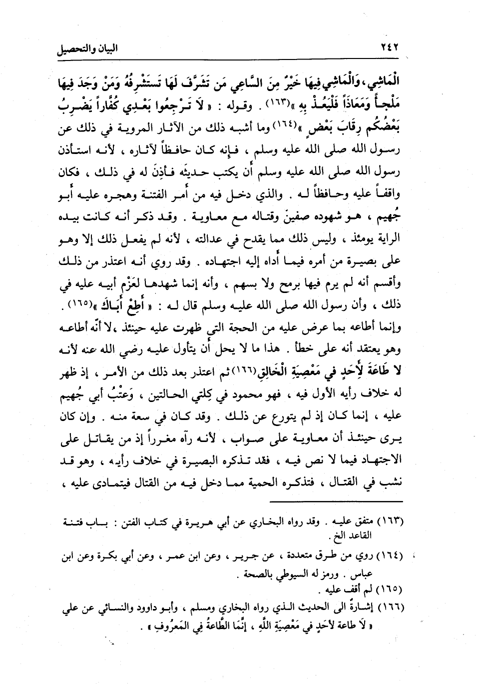 المَاشِي، وَالْمَاشِي فِيهَا خَيْرٌ مِنَ الساعِي مَن تَشَرَّفَ لَهَا تَستَشْرِفُه وَمَنْ وَجَد فيهَا مَلْجأً وَمَعَاذَاً فَلْيَعُذْ بِهِ ".» وقوله: «لَا تَرْجِعُوا بَعْدِي كُفِّاراً يَضرِب بَعْضُكُم رِقَابَ بَعْضٍ» وما أشبه ذلك من الآثار المروية في ذلك عن رسول الله - صَلَّى اللَّهُ عَلَيْهِ وَسَلَّمَ -، فإِنه كان حافظاً لآثاره، لأنه استأذن رسول الله - صَلَّى اللَّهُ عَلَيْهِ وَسَلَّمَ - أن يكتب حديثَه فأذِنَ له في ذلك، فكان واقفاً عليه وحافظاً له. والذي دخل فيه من أمر الفتنة وهجره عليه أبو جُهيم، هو شهوده صفين وقتاله مع معاوية. وقد ذكر أنه كانت بيده الراية يومئذ، وليس ذلك مما يقدح في عدالته، لأنه لم يفعل ذلك إلا وهو على بصيرة من أمره فيما أداه إليه اجتهاده.