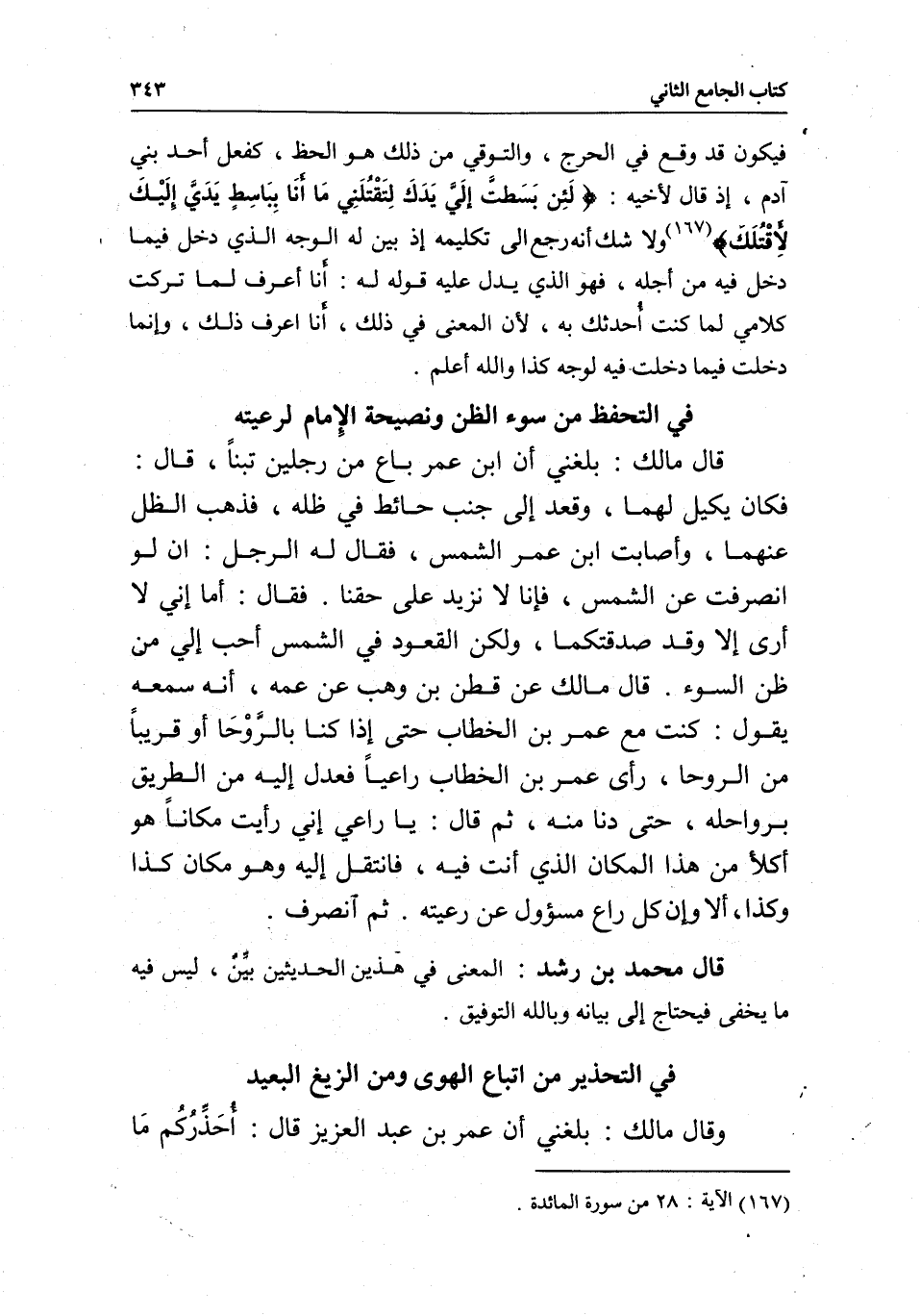 في التحذير من اتباع الهوى ومن الزيغ البعيد وقال مالك: بلغني أن عمر بن عبد العزيز قال: أُحَذِّرُكُم مَا