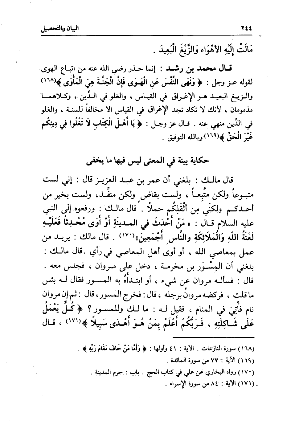 قال محمد بن رشد: إنما حذر - رَضِيَ اللَّهُ عَنْهُ - من اتباع الهوى لقوله عز وجل: {وَنَهَى النَّفْسَ عَنِ الْهَوَى} [النازعات: 40] {فَإِنَّ الْجَنَّةَ هِيَ الْمَأْوَى} [النازعات: 41] والزيغ البعيد هو الِإغراق في القياس، والغلو في الدِّين، وكلاهما مذمومان، لأنك لا تكاد تجد الِإغراق في القياس إلا مخالفاً للسنة، والغلو في الدِّين منهي عنه. قال عز وجل: {يَا أَهْلَ الْكِتَابِ لا تَغْلُوا فِي دِينِكُمْ غَيْرَ الْحَقِّ} [المائدة: 77] وبالله التوفيق.