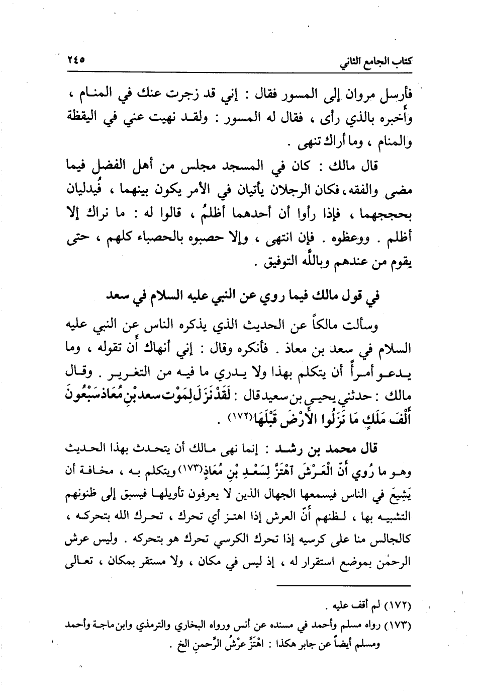 قال محمد بن رشد: إنما نهى مالك أن يتحدث بهذا الحديث وهو ما رُوي أنّ الْعَرْشَ اهْتَزَّ لِسَعْدِ بْنِ مُعَاذٍ ويتكلم به، مخافة أن يَشِيعَ في الناس فيسمعها الجهال الذين لا يعرفون تأويلها فيسبق إلى ظنونهم التشبيه بها، لظنهم أنّ العرش إذا اهتز أي تحرك، تحرك الله بتحركه، كالجالس منا على كرسيه إذا تحرك الكرسي تحرك هو بتحركه. وليس عرش الرحمن بموضع استقرار له، إذ ليس في مكان، ولا مستقر بمكان، تعالى