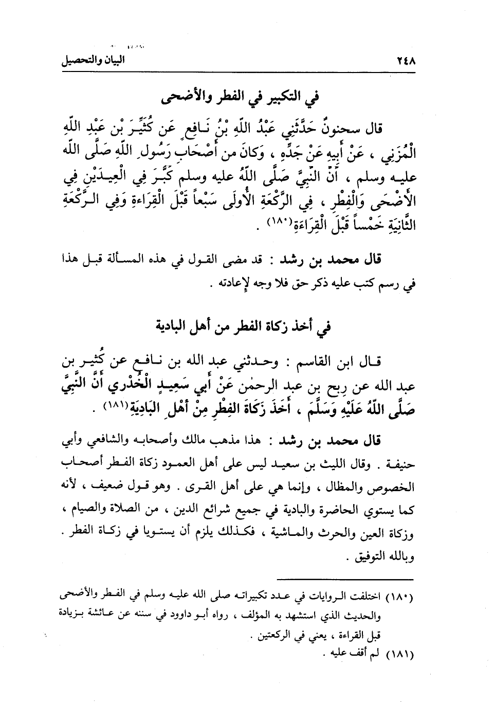 في التكبير في الفطر والأضحى قال سحنونٌ حَدَّثَنِي عَبْدُ اللهِ بن نَافِعٍ عَن كُثَيِّرَ بْن عَبْدِ اللهِ الْمُزَنِي، عَنْ أبيهِ عَنْ جَدِّهِ، وَكانَ من أصْحَاب رَسُول اللهِ - صَلَّى اللَّهُ عَلَيْهِ وَسَلَّمَ -، «أن النبِيَّ - صَلَّى اللَّهُ عَلَيْهِ وَسَلَّمَ - كَبَّرَ فِي الْعِيدَيْنِ فِي الأضْحَى وَالْفِطْرِ، فِي الرَّكْعَةِ الأولَى سَبْعاً قَبْلَ الْقِرَاءةِ وَفِي الرَّكْعَةِ الثَّانِيَةِ خَمْساً قَبْلَ الْقِرَاءَةِ» .