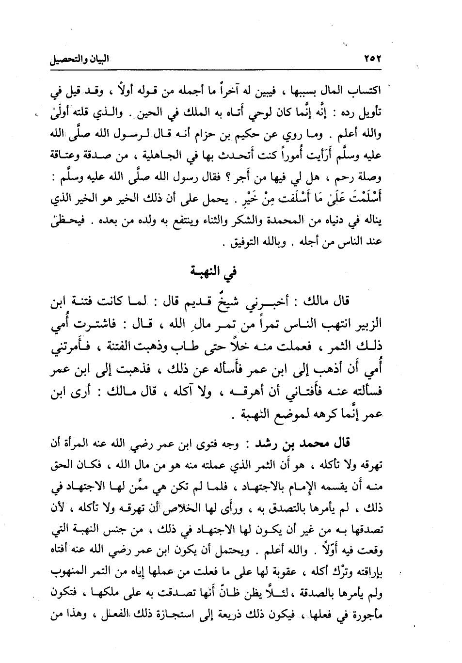 قال محمد بن رشد: وجه فتوى ابن عمر - رَضِيَ اللَّهُ عَنْهُ - المرأة أن تهرقه ولا تأكله، هو أن الثمر الذي عملته منه هو من مال الله، فكان الحق منه أن يقسمه الإمام بالاجتهاد، فلما لم تكن هي ممن لها الاجتهاد في ذلك، لم يأمرها بالتصدق به، ورأى لها الخلاص أن تهرقه ولا تأكله، لأن تصدقها به من غير أن يكون لها الاجتهاد في ذلك، من جنس النهبة التي وقعت فيه أولا. والله أعلم. ويحتمل أن يكون ابن عمر - رَضِيَ اللَّهُ عَنْهُ - أفتاه بإراقته وترك أكله، عقوبة لها على ما فعلت من عملها إياه من التمر المنهوب ولم يأمرها بالصدقة، لئلا يظن ظان أنها تصدقت به على ملكها، فتكون مأجورة في فعلها، فيكون ذلك ذريعة إلى استجازة ذلك الفعل، وهذا من