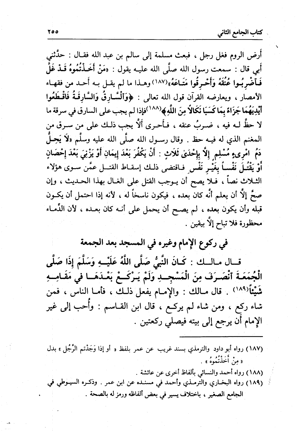 أرض الروم فغل رجل، فبعث مسلمة إلى سالم بن عبد الله فقال: حدثني أبي قال: سمعت رسول الله صَلَّى اللَّهُ عَلَيْهِ يقول: " من أخذتموه قد غل فاضربوا عنقه وأحرقوا متاعه» وهذا ما لم يقل به أحد من فقهاء الأمصار، ويعارضه القرآن قول الله تعالى: {وَالسَّارِقُ وَالسَّارِقَةُ فَاقْطَعُوا أَيْدِيَهُمَا جَزَاءً بِمَا كَسَبَا نَكَالا مِنَ اللَّهِ} [المائدة: 38] فإذا لم يجب على السارق في سرقة ما لا حظ له فيه، ضرب عنقه، فأحرى ألا يجب ذلك على من سرق من المغنم الذي له فيه حظ. وقال رسول الله - صَلَّى اللَّهُ عَلَيْهِ وَسَلَّمَ - «لا يحل دم امرئ مسلم إلا بإحدى ثلاث: أن يكفر بعد إيمان أو يزني بعد إحصان أو يقتل نفسا بغير نفس» فاقتضى ذلك إسقاط القتل عمن سوى هؤلاء الثلاث نصا، فلا يصح أن يوجب القتل على الغال بهذا الحديث، وإن صح إلا أن يعلم أنه كان بعده، فيكون ناسخا له، لأنه إذا احتمل أن يكون قبله وأن يكون بعده، لم يصح أن يحمل على أنه كان بعده، لأن الدماء محظورة فلا تباح إلا بيقين.
