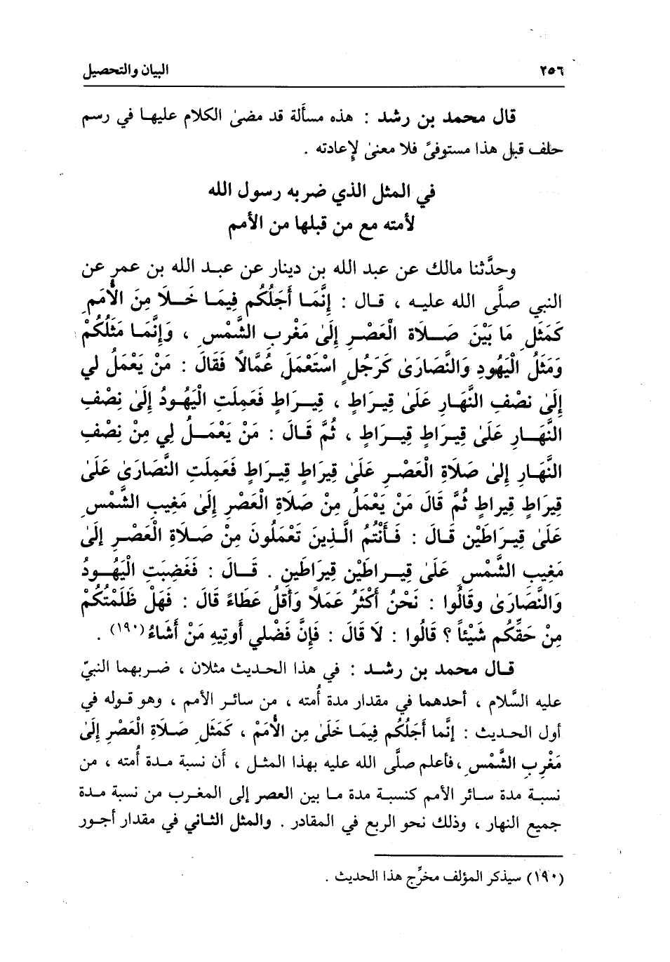 قال محمد بن رشد: في هذا الحديث مثلان، ضربهما النبي - عَلَيْهِ السَّلَامُ -، أحدهما في مقدار مدة أمته، من سائر الأمم، وهو قوله في أول الحديث: إنما أجلكم فيما خلا من الأمم، كمثل صلاة العصر إلى مغرب الشمس، فأعلم صَلَّى اللَّهُ عَلَيْهِ بهذا المثل، أن نسبة مدة أمته، من نسبة مدة سائر الأمم كنسبة مدة ما بين العصر إلى المغرب من نسبة مدة جميع النهار، وذلك نحو الربع في المقادر. والمثل الثاني في مقدار أجور