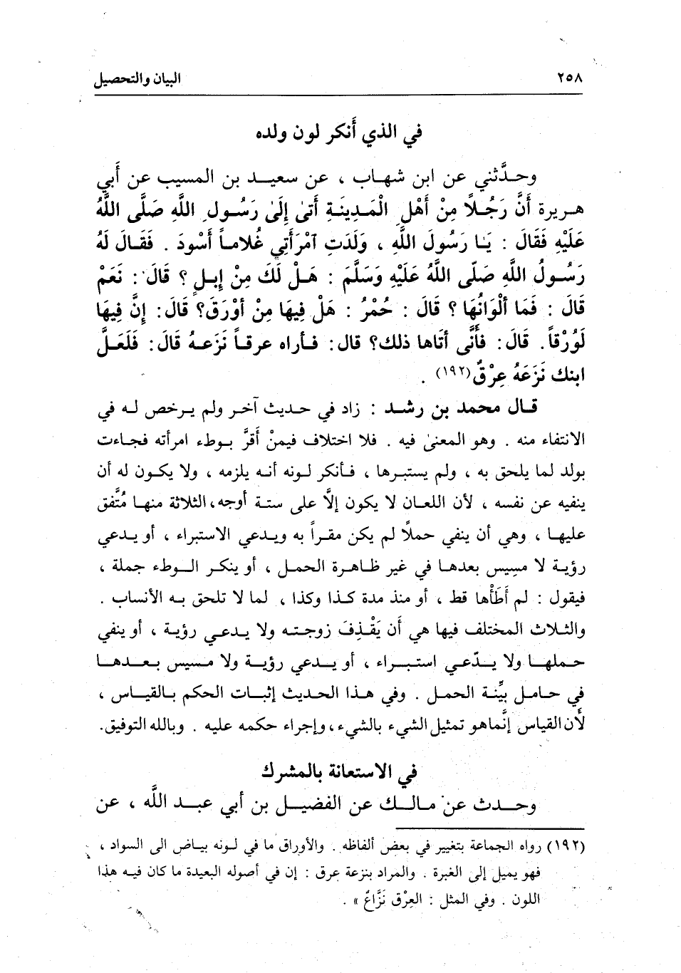 في الذي أنكر لون ولده وحدثني عن ابن شهاب، عن سعيد بن المسيب، عن أبي هريرة: «أن رجلا من أهل المدينة أتى إلى رسول الله صَلَّى اللَّهُ عَلَيْهِ فقال: يا رسول الله، ولدت امرأتي غلاما أسود. فقال له رسول الله - صَلَّى اللَّهُ عَلَيْهِ وَسَلَّمَ -: هل لك من إبل؟ قال: نعم، قال: فما ألوانها؟ قال: حمر، قال: هل فيها من أورق؟ قال: إن فيها لورقا. قال: فأنى أتاها ذلك؟ قال: فأراه عرقا نزعه، قال: فلعل ابنك نزعه عرق» .