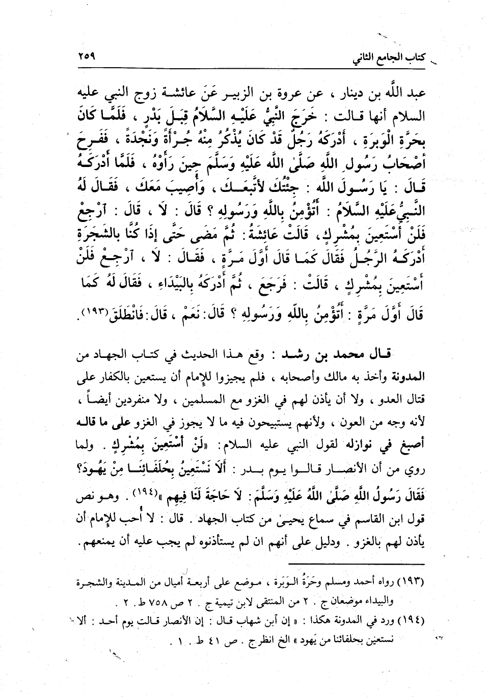 عبد الله بن دينار، عن عروة بن الزبير، «عن عائشة زوج النبي - عَلَيْهِ السَّلَامُ - أنها قالت: خرج النبي - عَلَيْهِ السَّلَامُ - قبل بدر، فلما كان بحرة الوبرة، أدركه رجل قد كان يذكر منه جرأة ونجدة، ففرح أصحاب رسول الله - صَلَّى اللَّهُ عَلَيْهِ وَسَلَّمَ - حين رأوه، فلما أدركه قال: يا رسول الله: جئتك لأتبعك، وأصيب معك، فقال له النبي - عَلَيْهِ السَّلَامُ -: أتؤمن بالله ورسوله؟ قال: لا، قال: أرجع فلن أستعين بمشرك، قالت عائشة: ثم مضى حتى إذا كنا بالشجرة أدركه الرجل فقال كما قال أول مرة، فقال: لا، أرجع فلن أستعين بمشرك، قالت. فرجع، ثم أدركه بالبيداء، فقال له كما قال أول مرة: أتؤمن بالله ورسوله؟ قال: نعم، قال: فانطلق» .