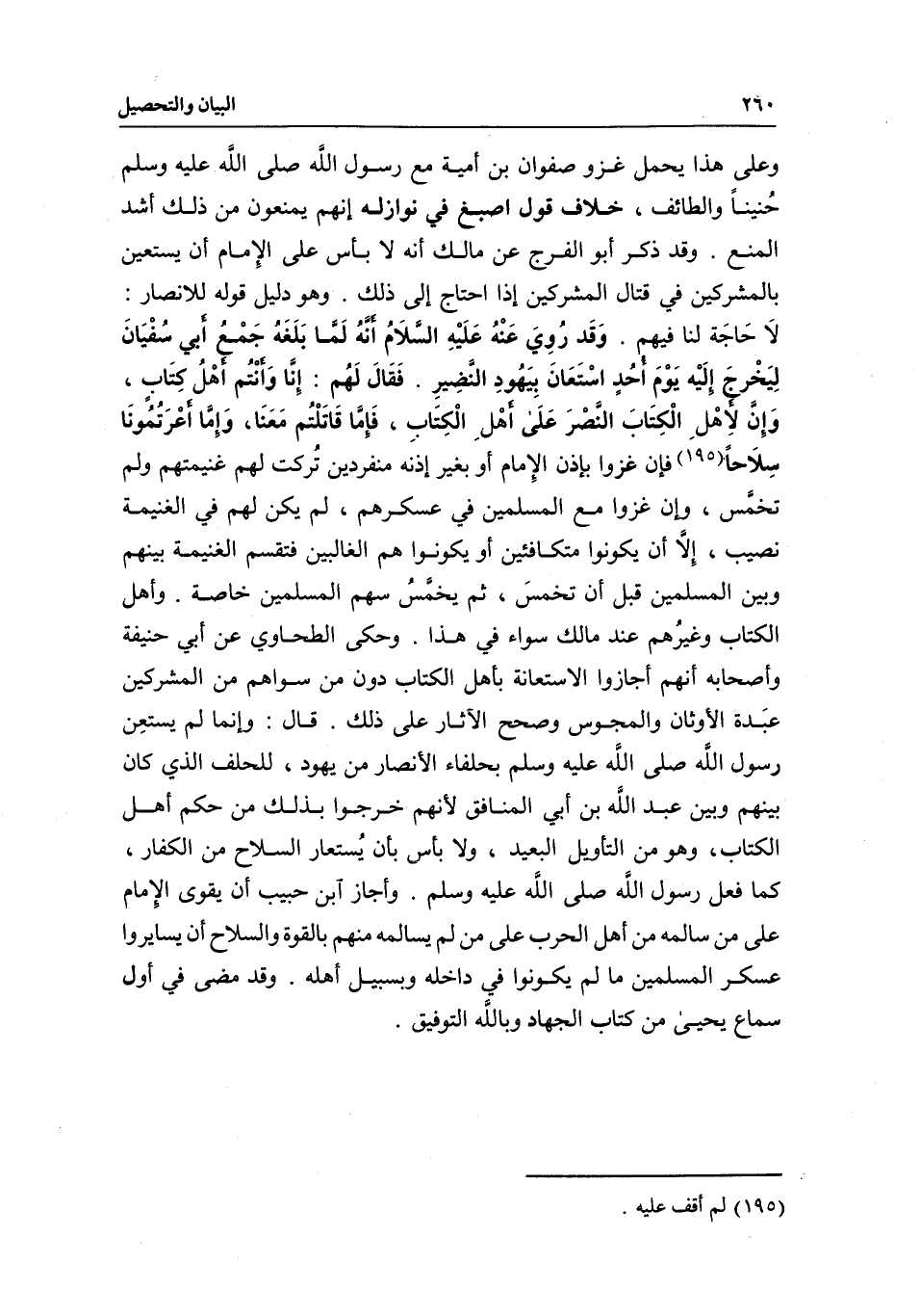 وعلى هذا يحمل غزو صفوان بن أمية مع رسول الله - صَلَّى اللَّهُ عَلَيْهِ وَسَلَّمَ - حنينا والطائف، خلاف قول أصبغ في نوازله إنهم يمنعون من ذلك أشد المنع. وقد ذكر أبو الفرج عن مالك أنه لا بأس على الإمام أن يستعين بالمشركين في قتال المشركين إذا احتاج إلى ذلك. وهو دليل قوله للأنصار: لا حاجة لنا فيهم. وقد روي عنه - عَلَيْهِ السَّلَامُ - «أنه لما بلغه جمع أبي سفيان ليخرج إليه يوم أحد استعان بيهود النضير. فقال لهم: (إنا وأنتم أهل كتاب، وإن لأهل الكتاب النصر على أهل الكتاب، فإما قاتلتم معنا، وإما أعرتمونا سلاحا» فإن غزوا بإذن الإمام أو بغير إذنه منفردين تركت لهم غنيمتهم ولم تخمس، وإن غزوا مع المسلمين في عسكرهم، لم يكن لهم في الغنيمة نصيب، إلا أن يكونوا متكافئين أو يكونوا هم الغالبين فتقسم الغنيمة بينهم وبين المسلمين قبل أن تخمس، ثم يخمس سهم المسلمين خاصة. وأهل الكتاب وغيرهم عند مالك سواء في هذا. وحكى الطحاوي عن أبي حنيفة وأصحابه أنهم أجازوا الاستعانة بأهل الكتاب دون من سواهم من المشركين عبدة الأوثان والمجوس، وصحح الآثار على ذلك. قال: وإنما لم يستعن رسول الله - صَلَّى اللَّهُ عَلَيْهِ وَسَلَّمَ - بحلفاء الأنصار من يهود، للحلف الذي كان بينهم وبين عبد الله بن أبي المنافق؛ لأنهم خرجوا بذلك من حكم أهل الكتاب، وهو من التأويل البعيد، ولا بأس بأن يستعار السلاح من الكفار، كما فعل رسول الله - صَلَّى اللَّهُ عَلَيْهِ وَسَلَّمَ -. وأجاز ابن حبيب أن يقوى الإمام على من سالمه من أهل الحرب على من لم يسالمه منهم بالقوة والسلاح أن يسايروا عسكر المسلمين ما لم يكونوا في داخله وبسبيل أهله. وقد مضى في أول سماع يحيى من كتاب الجهاد، وبالله التوفيق.