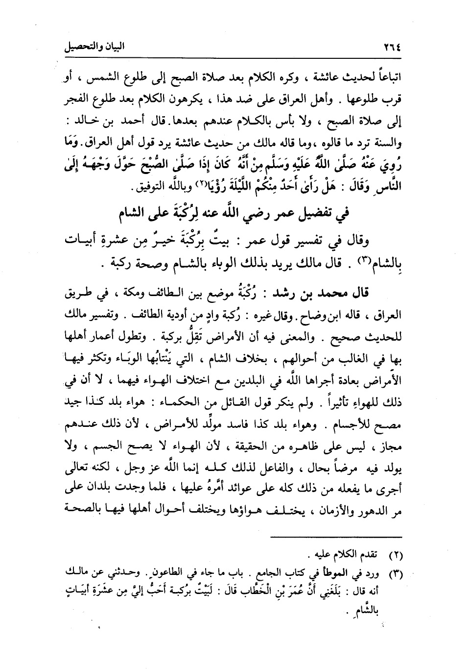 وقال في تفسير قول عمر: بيت بركبة خير من عشرة أبيات بالشام. قال مالك: يريد بذلك الوباء بالشام وصحة ركبة.