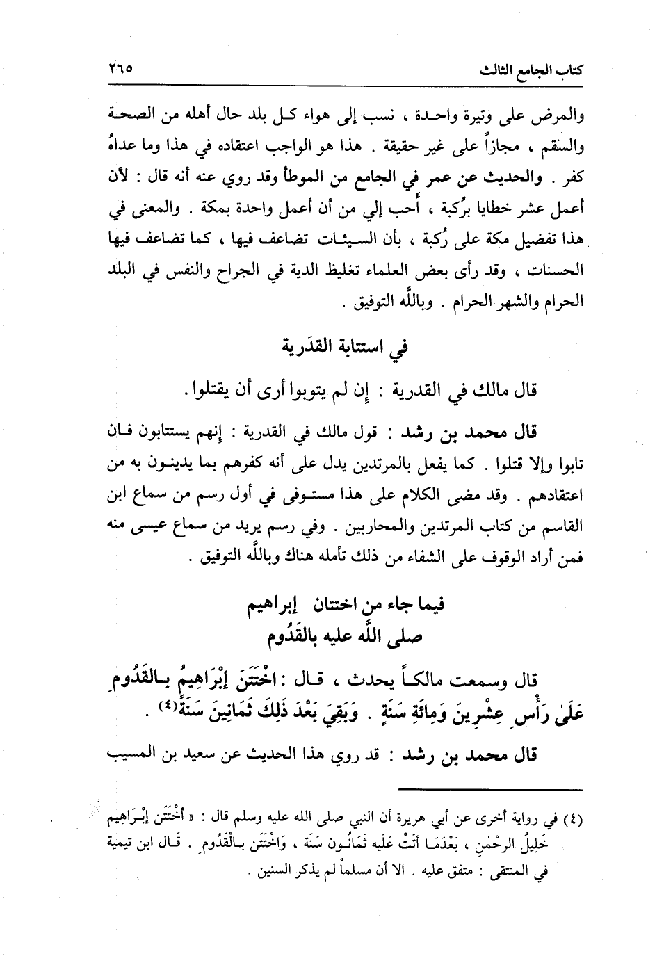 صَلَّى اللَّهُ عَلَيْهِ بالقدوم قال: وسمعت مالكا يحدث، قال: «اختتن إبراهيم بالقدوم على رأس عشرين ومائة سنة. وبقي بعد ذلك ثمانين سنة» .