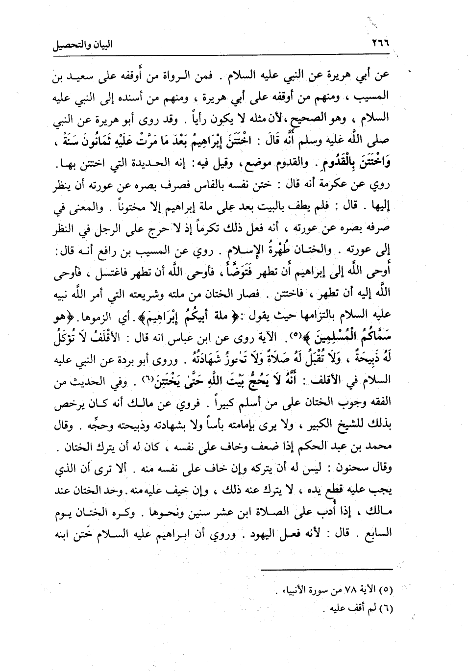 عن أبي هريرة، عن النبي - عَلَيْهِ السَّلَامُ -. فمن الرواة من أوقفه على سعيد بن المسيب، ومنهم من أوقفه على أبي هريرة، ومنهم من أسنده إلى النبي - عَلَيْهِ السَّلَامُ -، وهو الصحيح؛ لأن مثله لا يكون رأيا. وقد روى أبو هريرة عن النبي صلى الله غليه وسلم أنه قال: اختتن إبراهيم بعد ما مرت عليه ثمانون سنة، واختتن بالقدوم. والقدوم موضع، وقيل فيه: إنه الحديدة التي اختتن بها. روي عن عكرمة أنه قال: ختن نفسه بالفاس فصرف بصره عن عورته أن ينظر إليها. قال: فلم يطف بالبيت بعد على ملة إبراهيم إلا مختونا. والمعنى في صرفه بصره عن عورته، أنه فعل ذلك تكرما إذ لا حرج على الرجل في النظر إلى عورته. والختان طهرة الإسلام. روي عن المسيب بن رافع أنه قال: أوحى الله إلى إبراهيم أن تطهر فتوضأ، فأوحى الله أن تطهر فاغتسل، فأوحى الله إليه أن تطهر، فاختتن. فصار الختان من ملته وشريعته التي أمر الله نبيه - عَلَيْهِ السَّلَامُ - بالتزامها حيث يقول: {مِلَّةَ أَبِيكُمْ إِبْرَاهِيمَ} [الحج: 78] . أي الزموها. {هُوَ سَمَّاكُمُ الْمُسْلِمِينَ} [الحج: 78] . الآية. روي عن ابن عباس أنه قال: الأقلف لا تؤكل له ذبيحة، ولا تقبل له صلاة، ولا تجوز شهادته. وروى أبو بردة عن النبي - عَلَيْهِ السَّلَامُ - في الأقلف: «أنه لا يحج بيت الله حتى يختتن» . وفي الحديث من الفقه وجوب الختان على من أسلم كبيرا. فروي عن مالك أنه كان يرخص بذلك للشيخ الكبير، ولا يرى بإمامته بأسا، ولا بشهادته وذبيحته وحجه. وقال محمد بن عبد الحكم: إذا ضعف وخاف على نفسه، كان له أن يترك الختان. وقال سحنون: ليس له أن يتركه، وإن خاف على نفسه منه. ألا ترى أن الذي يجب عليه قطع يده، لا يترك عنه ذلك، وإن خيف عليه منه. وحد الختان عند مالك، إذا أدب على الصلاة ابن عشر سنين ونحوها. وكره الختان يوم السابع. قال: لأنه فعل اليهود. وروي أن إبراهيم عليه السلام ختن ابنه