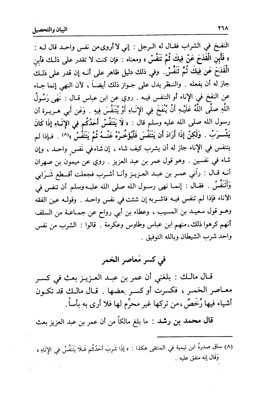 النفخ في الشراب فقال له الرجل: إني لا أروى من نفس واحد قال له: «فأبن القدح عن فيك ثم تنفس» ومعناه: فإن كنت لا تقدر على ذلك فأبن القدح عن فيك ثم تنفس. وفي ذلك دليل ظاهر على أنه إن قدر على ذلك جاز له أن يفعله. والنظر يدل على جواز ذلك أيضا؛ لأن النهي إنما جاء عن النفخ في الإناء أو التنفس فيه. روي عن ابن عباس قال: «نهى رسول الله صَلَّى اللَّهُ عَلَيْهِ أن ينفخ في الإناء أو يتنفس فيه» . وعن أبي هريرة أن رسول الله - صَلَّى اللَّهُ عَلَيْهِ وَسَلَّمَ - قال: «لا يتنفس أحدكم في الإناء إذا كان يشرب. ولكن إذا أراد أن يتنفس فليؤخره عنه ثم يتنفس» . فإذا لم يتنفس في الإناء جاز له أن يشرب كيف شاء، إن شاء في نفس واحد، وإن شاء في نفسين. وهو قول عمر بن عبد العزيز. روي عن ميمون بن مهران أنه قال: رآني عمر بن عبد العزيز وأنا أشرب، فجعلت أقطع شرابي وأتنفس. فقال: إنما نهى رسول الله - صَلَّى اللَّهُ عَلَيْهِ وَسَلَّمَ - أن تنفس في الإناء، فإذا لم تنفس فيه فاشربه إن شئت في نفس واحد. وقوله عين الفقه، وهو قول سعيد بن المسيب، وعطاء بن أبي رباح عن جماعة من السلف، أنهم كرهوا ذلك، منهم ابن عباس وطاوس وعكرمة. قالوا: الشرب من نفس واحد شرب الشيطان، وبالله التوفيق.