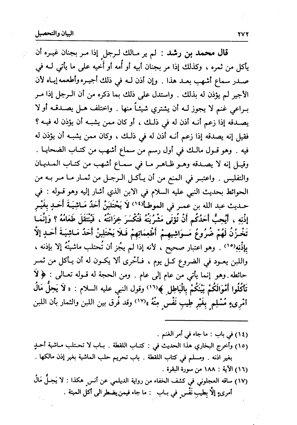 قال محمد بن رشد: لم ير مالك لرجل إذا مر بجنان غيره أن يأكل من ثمره، وكذلك إذا مر بجنان أبيه أو أمه أو أخيه على ما يأتي له في صدر سماع أشهب بعد هذا. وإن أذن له في ذلك أجيره وأطعمه إياه؛ لأن الأجير لم يؤذن له بذلك. واستدل على ذلك بما ذكره من أن الرجل إذا مر براعي غنم لا يجوز له أن يشتري شيئا منها. واختلف هل يصدقه أولا يصدقه إذا زعم أنه أذن له في ذلك، أو كان ممن يشبه أن يؤذن له فيه؟ فقيل: إنه يصدقه إذا زعم أنه أذن له في ذلك، وكان ممن يشبه أن يؤذن له فيه. وهو قول مالك في أول رسم من سماع أشهب من كتاب الضحايا. وقيل: إنه لا يصدقه وهو ظاهر ما في سماع أشهب من كتاب المديان والتفليس. واعتبر في المنع من أن يأكل الرجل من ثمار ما مر به من الحوائط بحديث النبي - عَلَيْهِ السَّلَامُ - في الابن الذي أشار إليه، وهو قوله في حديث عبد الله بن عمر في الموطأ: «لا يحتلبن أحد ماشية أحد بغير إذنه، أيحب أحدكم أن تؤتى مشربته فتكسر خزانته، فينتقل طعامه؟، وإنما تخزن لهم ضروع مواشيهم أطعماتهم، فلا يحتلبن أحد ماشية أحد إلا بإذنه» . وهو اعتبار صحيح؛ لأنه إذا لم يجز أن تحتلب ماشيته إلا بإذنه، واللبن يعود في الضروع كل يوم، فأحرى ألا يكون له أن يأكل من ثمر حائطه. وهو إنما يأتي من عام إلى عام. ومن الحجة له قوله تعالى: {لا تَأْكُلُوا أَمْوَالَكُمْ بَيْنَكُمْ بِالْبَاطِلِ} [النساء: 29] وقول النبي - عَلَيْهِ السَّلَامُ -: «لا يحل مال امرئ مسلم بغير طيب نفس منه» وقد فرق بين اللبن والثمار بأن اللبن