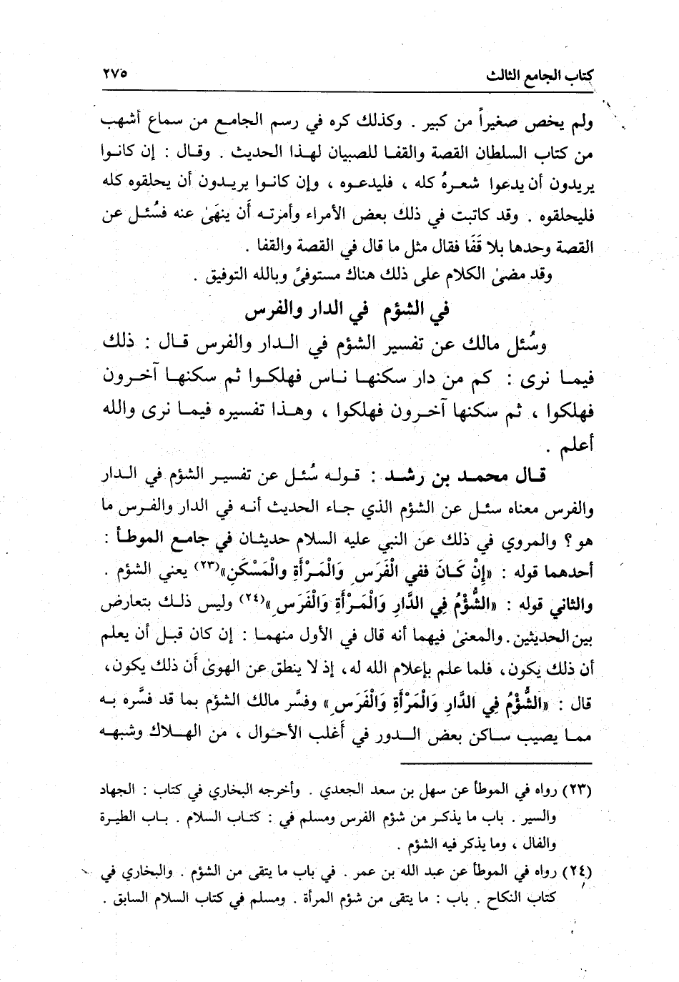 وسئل مالك عن تفسير الشؤم في الدار والفرس قال: ذلك فيما نرى: كم من دار سكنها ناس فهلكوا ثم سكنها آخرون فهلكوا، ثم سكنها آخرون فهلكوا، وهذا تفسيره فيما نرى، والله أعلم.