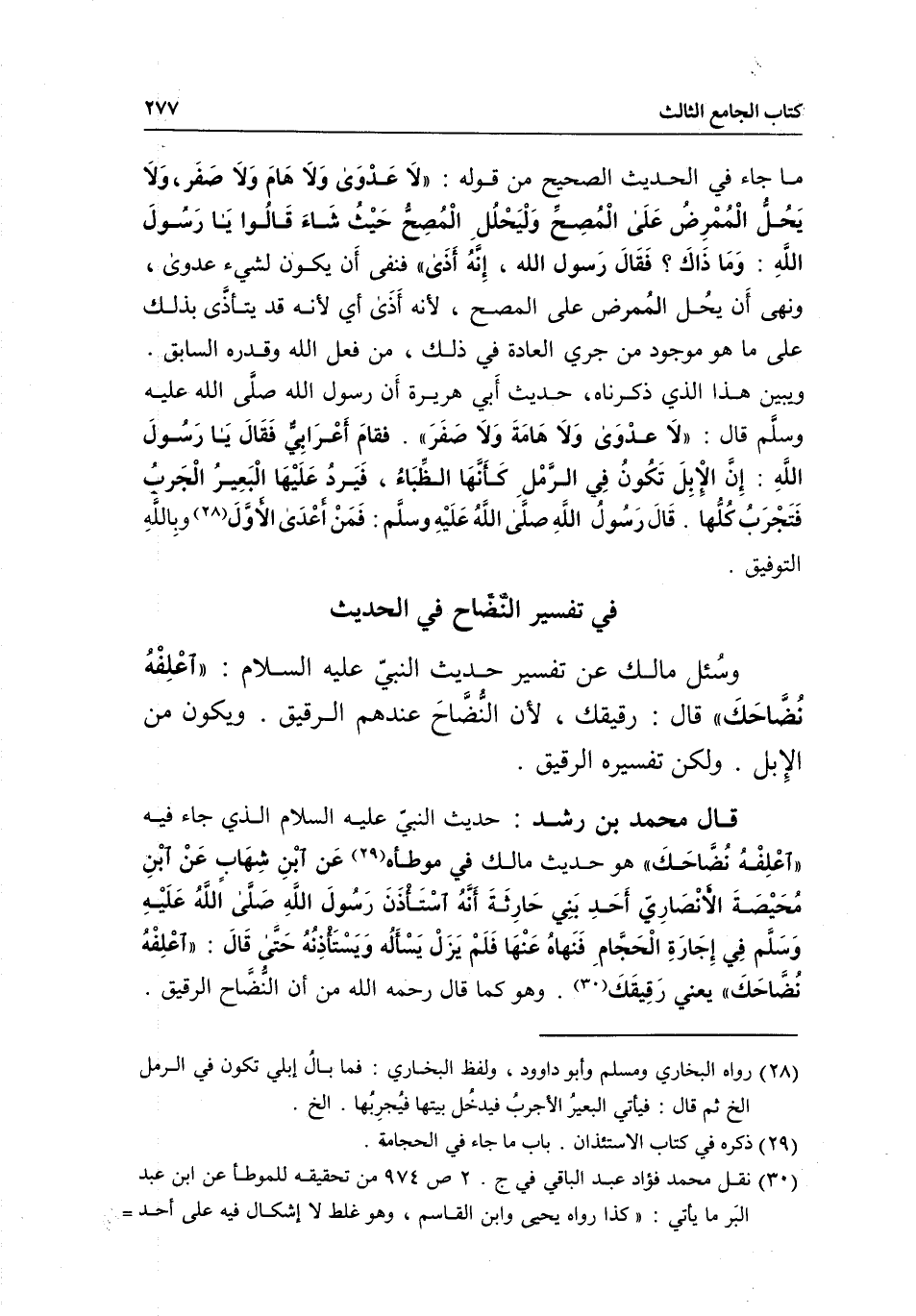 في تفسير النضاح في الحديث وسئل مالك عن تفسير حديث النبي - عَلَيْهِ السَّلَامُ -: «اعلفه نضاحك» " قال: رقيقك؛ لأن النضاح عندهم الرقيق. ويكون من الإبل. ولكن تفسيره الرقيق.