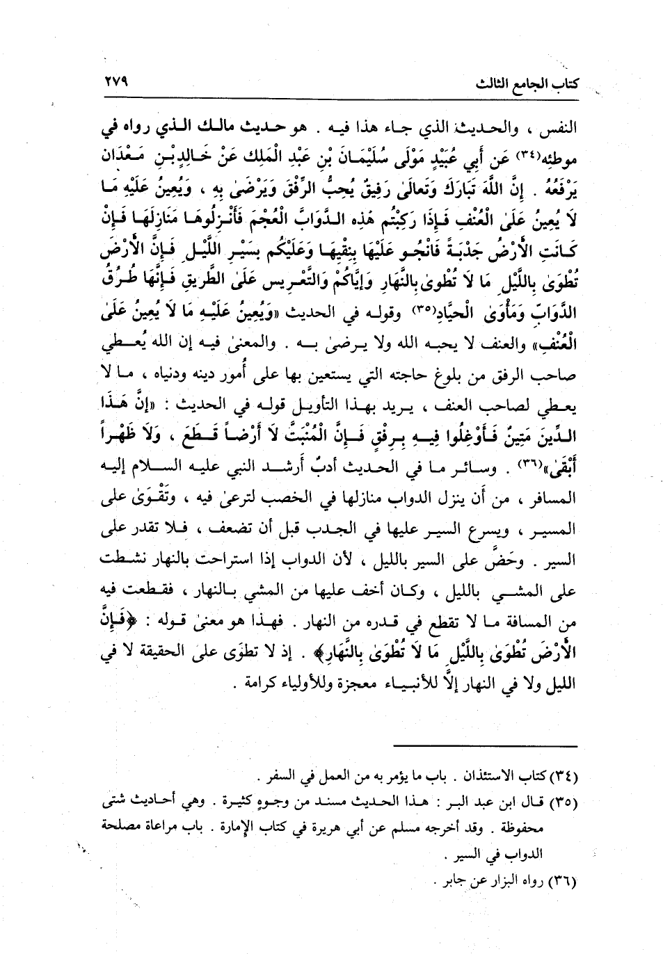 النفس، والحديث الذي جاء هذا فيه. هو حديث مالك الذي رواه في موطئه عن أبي عبيد مولى سليمان بن عبد الملك، عن خالد بن معدان يرفعه: «إن الله تبارك وتعالى رفيق يحب الرفق ويرضى به، ويعين عليه ما لا يعين على العنف، فإذا ركبتم هذه الدواب العجم فأنزلوها منازلها، فإن كانت الأرض جدبة فانجو عليها بنقيها، وعليكم بسير الليل، فإن الأرض تطوى بالليل ما لا تطوى بالنهار، وإياكم والتعريس على الطريق، فإنها طرق الدواب، ومأوى الحيات» وقوله في الحديث «ويعين عليه ما لا يعين على العنف» والعنف لا يحبه الله ولا يرضى به. والمعنى فيه إن الله يعطي صاحب الرفق من بلوغ حاجته التي يستعين بها على أمور دينه ودنياه، ما لا يعطي لصاحب العنف، يريد بهذا التأويل قوله في الحديث: «إن هذا الدين متين فأوغلوا فيه برفق فإن المنبت لا أرضا قطع، ولا ظهرا أبقى» . وسائر ما في الحديث أدب أرشد النبي عليه السلام إليه المسافر، من أن ينزل الدواب منازلها في الخصب لترعى فيه، وتقوى على المسير، ويسرع السير عليها في الجدب قبل أن تضعف، فلا تقدر على السير. وحض على السير بالليل؛ لأن الدواب إذا استراحت بالنهار نشطت على المشي بالليل، وكان أخف عليها من المشي بالنهار، فقطعت فيه من المسافة ما لا تقطع في قدره من النهار. فهذا هو معنى قوله: «فإن الأرض تطوى بالليل ما لا تطوى بالنهار» . إذ لا تطوى على الحقيقة لا في الليل ولا في النهار إلا للأنبياء معجزة وللأولياء كرامة.