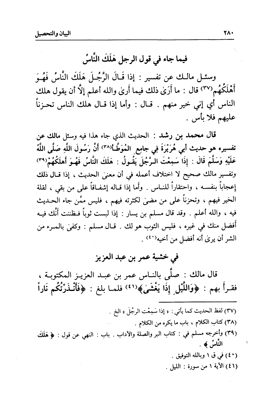قال محمد بن رشد: الحديث الذي جاء هذا فيه وسئل مالك عن تفسيره هو حديث أبي هريرة في جامع الموطأ أن رسول الله - صَلَّى اللَّهُ عَلَيْهِ وَسَلَّمَ - قال: «إذا سمعت الرجل يقول: هلك الناس فهو أهلكهم» وتفسير مالك صحيح لا اختلاف أعلمه في أن معنى الحديث، إذا قال ذلك إعجابا بنفسه، واحتقارا للناس. وأما إذا قاله إشفاقا على من بقي، لقلة الخير فيهم، وتحزنا على من مضى لكثرته فيهم، فليس ممن جاء الحديث فيه، والله أعلم. وقد قال مسلم بن يسار: إذا لبست ثوبا فظننت أنك فيه أفضل منك في غيره، فليس الثوب هو لك. قال مسلم: وكفى بالمرء من الشر أن يرى أنه أفضل من أخيه.