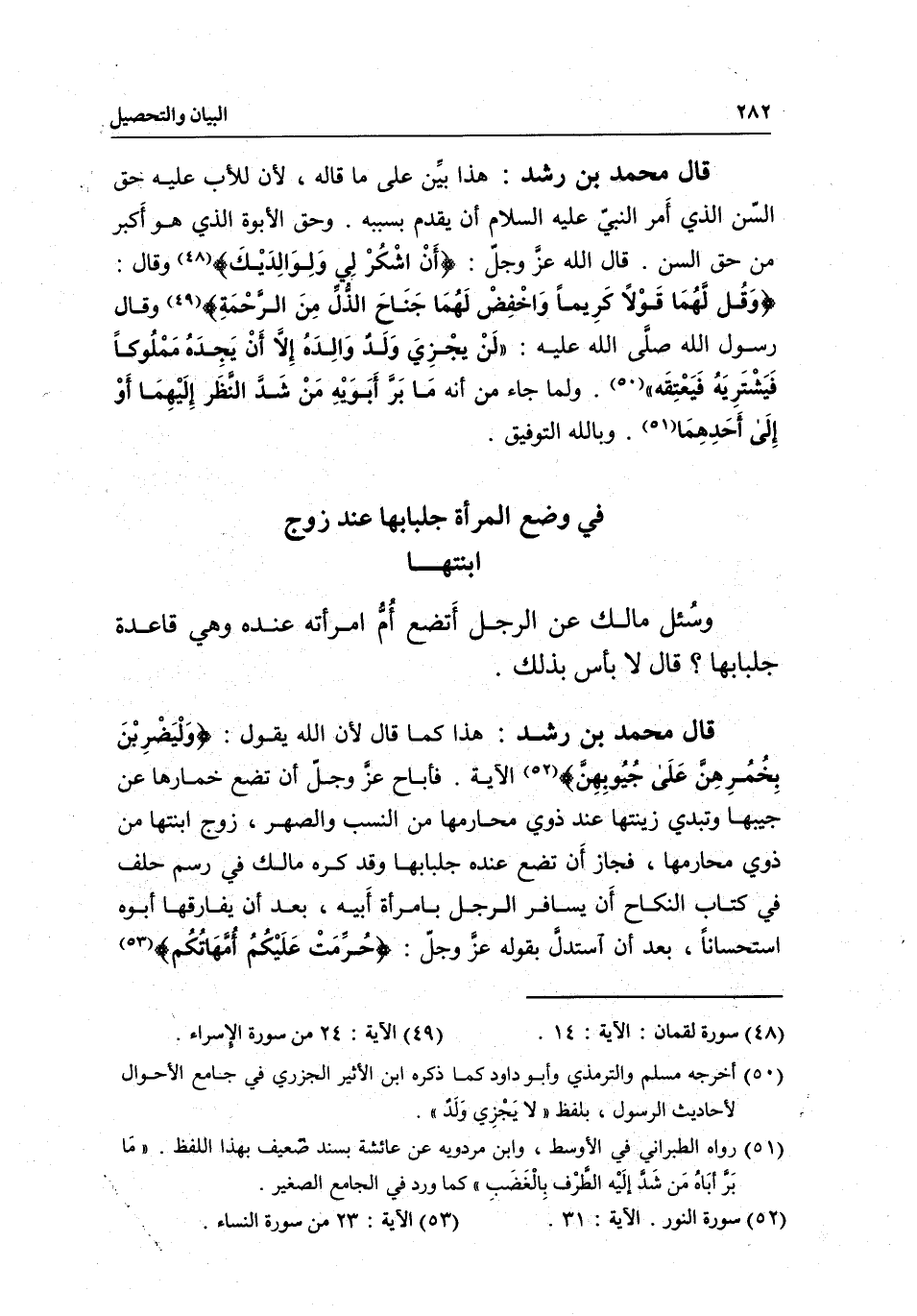 قال محمد بن رشد: هذا كما قال؛ لأن الله يقول: {وَلْيَضْرِبْنَ بِخُمُرِهِنَّ عَلَى جُيُوبِهِنَّ} [النور: 31] الآية. فأباح عز وجل أن تضع خمارها عن جيبها وتبدي زينتها عند ذوي محارمها من النسب والصهر، زوج ابنتها من ذوي محارمها، فجاز أن تضع عنده جلبابها، وقد كره مالك في رسم حلف في كتاب النكاح أن يسافر الرجل بامرأة أبيه، بعد أن يفارقها أبوه استحسانا، بعد أن استدل بقوله عز وجل: {حُرِّمَتْ عَلَيْكُمْ أُمَّهَاتُكُمْ} [النساء: 23]