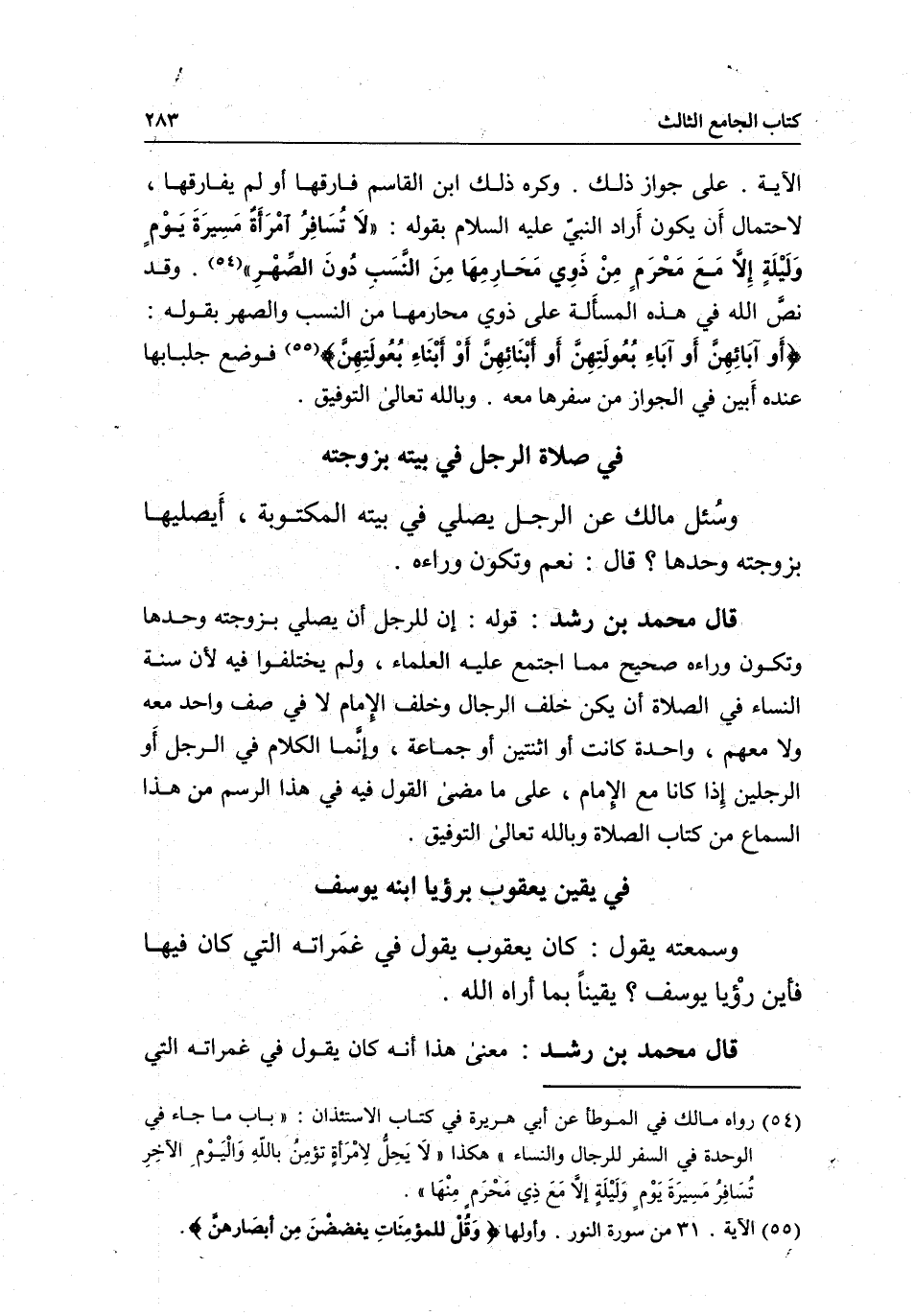 الآية. على جواز ذلك. وكره ذلك ابن القاسم فارقها أو لم يفارقها، لاحتمال أن يكون أراد النبي - عَلَيْهِ السَّلَامُ - بقوله: «لا تسافر امرأة مسيرة يوم وليلة إلا مع محرم من ذوي محارمها» من النسب دون الصهر. وقد نص الله في هذه المسألة على ذوي محارمها من النسب والصهر بقوله: {آبَائِهِنَّ أَوْ آبَاءِ بُعُولَتِهِنَّ أَوْ أَبْنَائِهِنَّ أَوْ أَبْنَاءِ بُعُولَتِهِنَّ} [النور: 31] فوضع جلبابها عنده أبين في الجواز من سفرها معه. وبالله تعالى التوفيق.