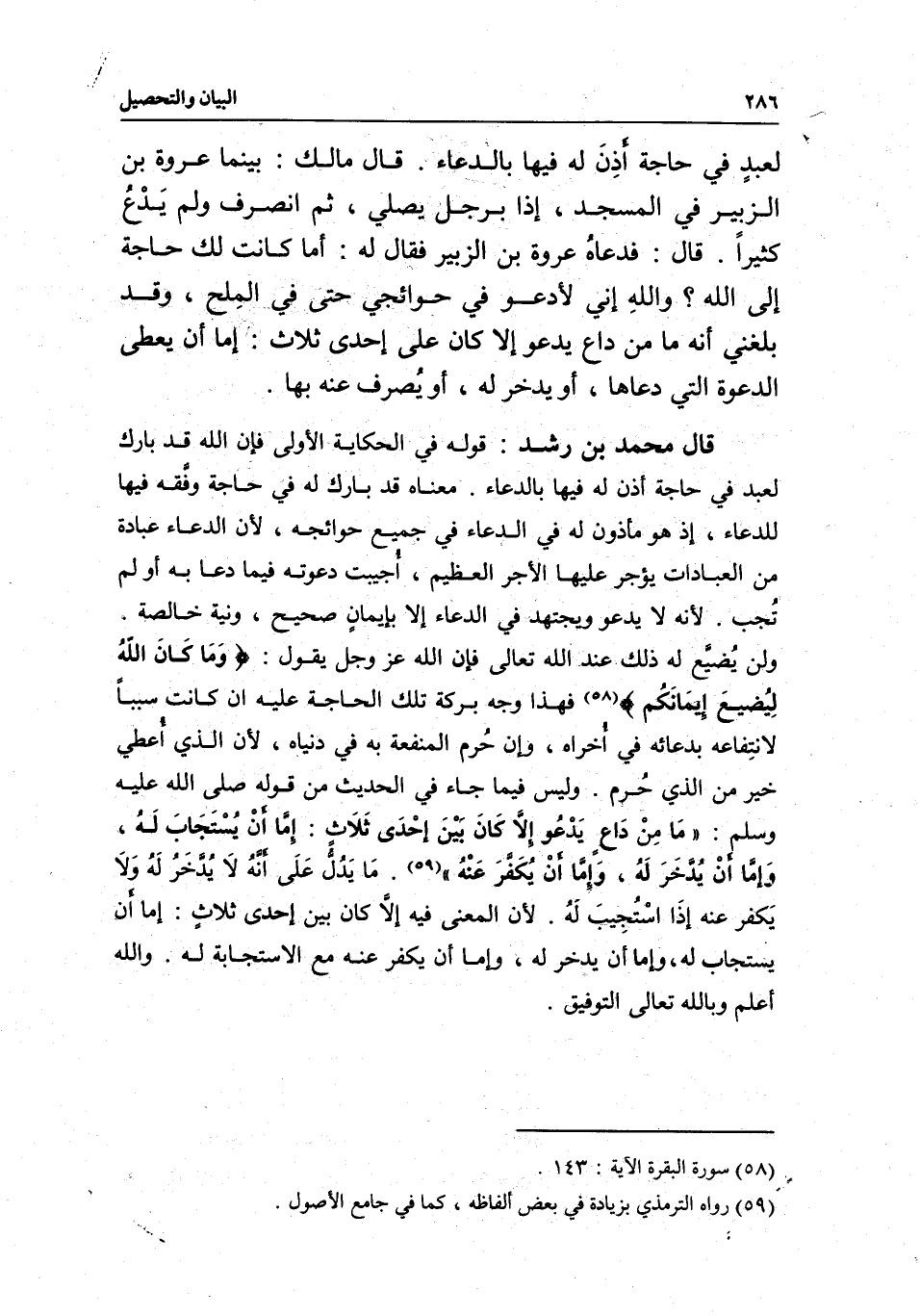 قال محمد بن رشد: قوله في الحكاية الأولى: فإن الله قد بارك لعبد في حاجة أذن له فيها بالدعاء. معناه قد بارك له في حاجة وفقه فيها للدعاء، إذ هو مأذون له في الدعاء في جميع حوائجه؛ لأن الدعاء عبادة من العبادات يؤجر عليها الأجر العظيم، أجيبت دعوته فيما دعا به أو لم تجب. لأنه لا يدعو ويجتهد في الدعاء إلا بإيمان صحيح، ونية خالصة. ولن يضيع له ذلك عند الله تعالى، فإن الله عز وجل يقول: {وَمَا كَانَ اللَّهُ لِيُضِيعَ إِيمَانَكُمْ} [البقرة: 143] فهذا وجه بركة تلك الحاجة عليه إن كانت سببا لانتفاعه بدعائه في أخراه، وإن حرم المنفعة به في دنياه؛ لأن الذي أعطي خير من الذي حرم. وليس فيما جاء في الحديث من قوله - صَلَّى اللَّهُ عَلَيْهِ وَسَلَّمَ -: «ما من داع يدعو إلا كان بين إحدى ثلاث: إما أن يستجاب له، وإما أن يدخر له، وإما أن يكفر عنه» . ما يدل على أنه لا يدخر له ولا يكفر عنه إذا استجيب له. لأن المعنى فيه إلا كان بين إحدى ثلاث: إما أن يستجاب له، وإما أن يدخر له، وإما أن يكفر عنه مع الاستجابة له. والله أعلم، وبالله تعالى التوفيق.