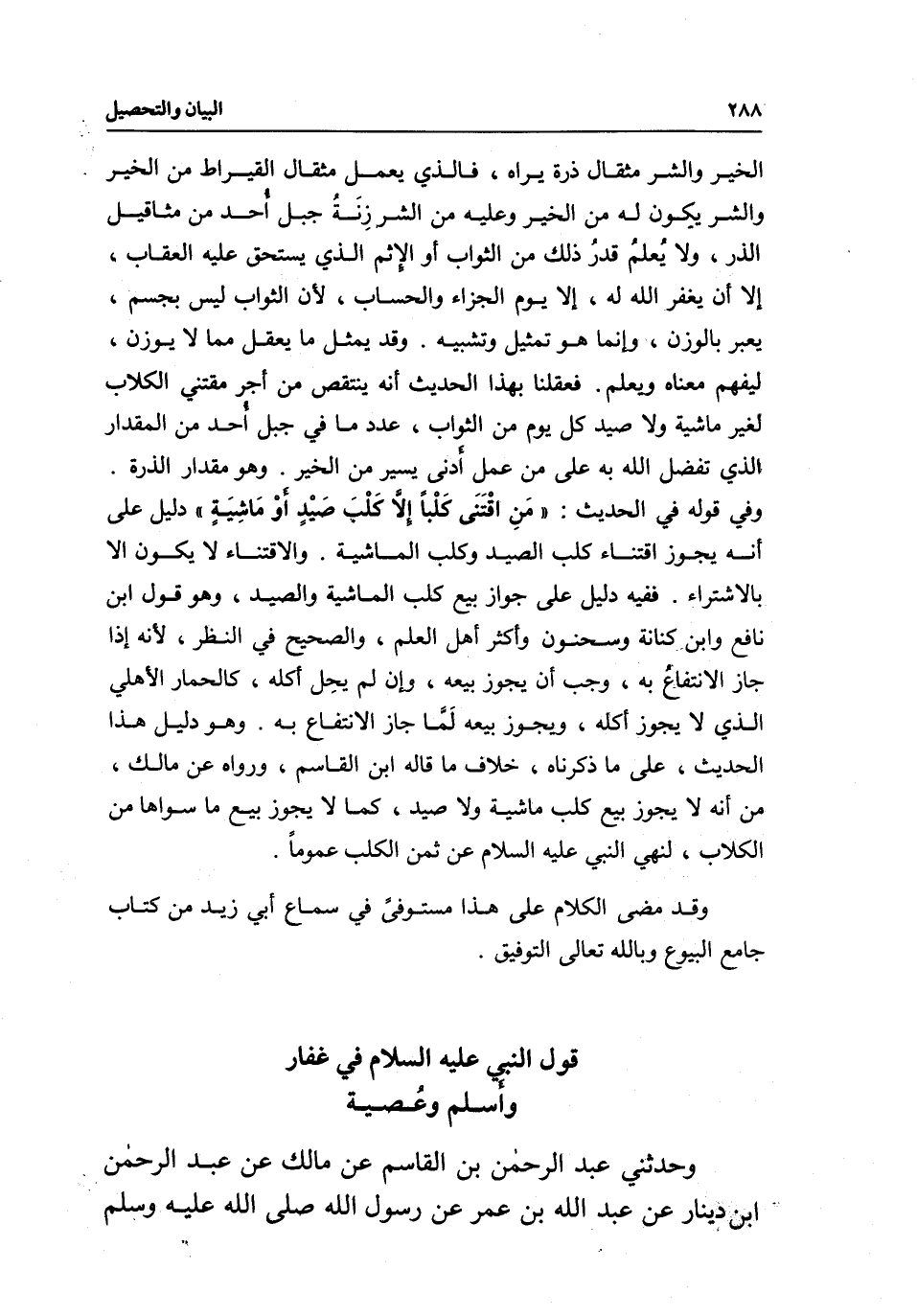 الخير والشر مثقال ذرة يراه، فالذي يعمل مثقال القيراط من الخير والشر. يكون له من الخير وعليه من الشر زنة جبل أحد من مثاقيل الذر، ولا يعلم قدر ذلك من الثواب أو الإثم الذي يستحق عليه العقاب، إلا أن يغفر الله له، إلا يوم الجزاء والحساب؛ لأن الثواب ليس بجسم، يعبر بالوزن، وإنما هو تمثيل وتشبيه. وقد يمثل ما يعقل مما لا يوزن، ليفهم معناه ويعلم. فعقلنا بهذا الحديث أنه ينتقص من أجر مقتني الكلاب لغير ماشية ولا صيد كل يوم من الثواب، عدد ما في جبل أحد من المقدار الذي تفضل الله به على من عمل أدنى يسير من الخير. وهو مقدار الذرة. وفي قوله في الحديث: «من اقتنى كلبا إلا كلب صيد أو ماشية» دليل على أنه يجوز اقتناء كلب الصيد وكلب الماشية. والاقتناء لا يكون إلا بالاشتراء. ففيه دليل على جواز بيع كلب الماشية والصيد، وهو قول ابن نافع وابن كنانة وسحنون وأكثر أهل العلم، والصحيح في النظر؛ لأنه إذا جاز الانتفاع به، وجب أن يجوز بيعه، وإن لم يحل أكله، كالحمار الأهلي الذي لا يجوز أكله، ويجوز بيعه لما جاز الانتفاع به. وهو دليل هذا الحديث، على ما ذكرناه، خلاف ما قاله ابن القاسم، ورواه عن مالك، من أنه لا يجوز بيع كلب ماشية ولا صيد، كما لا يجوز بيع ما سواها من الكلاب، لنهي النبي - عَلَيْهِ السَّلَامُ - عن ثمن الكلب عموما.