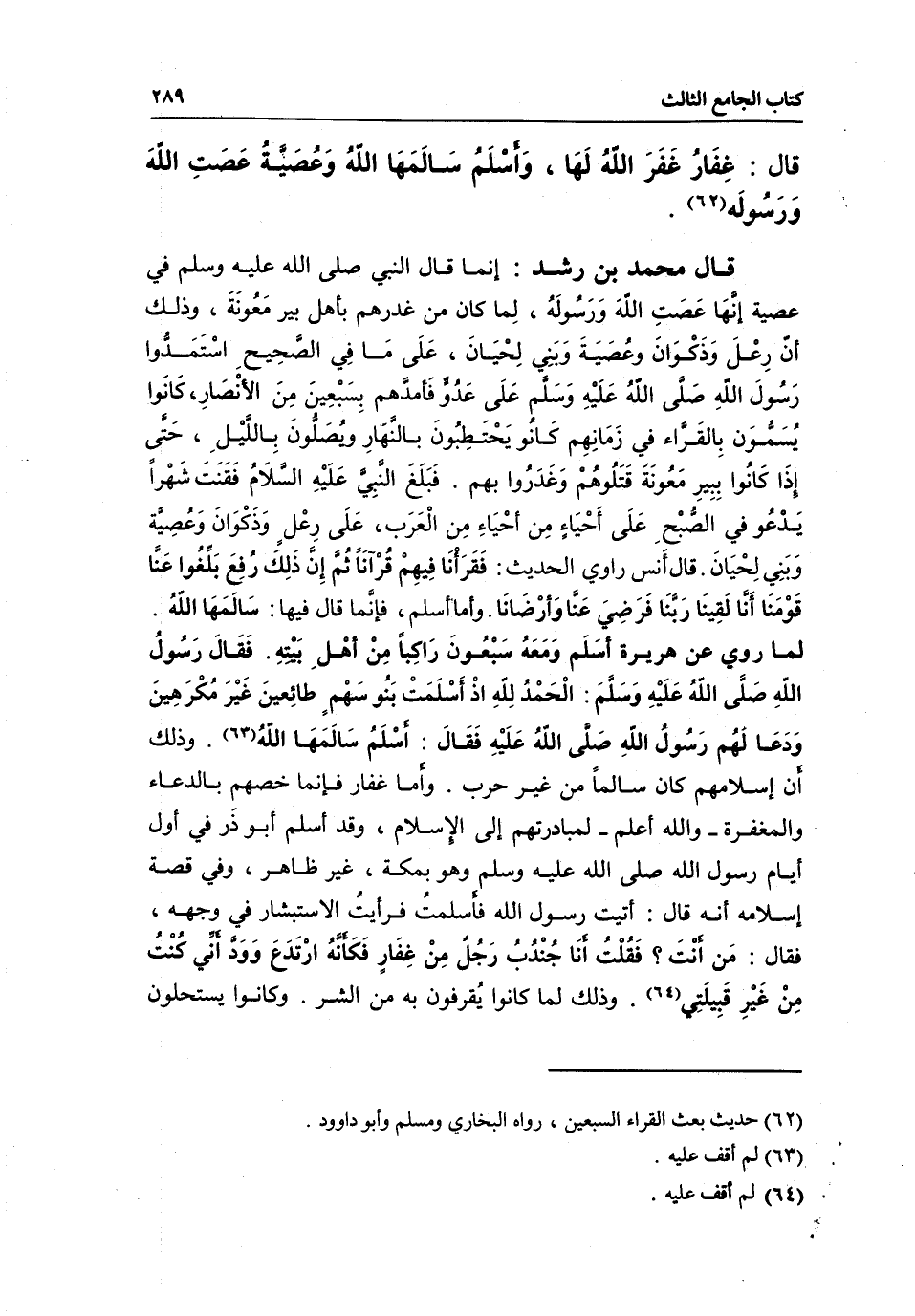 قال محمد بن رشد: إنما قال النبي - صَلَّى اللَّهُ عَلَيْهِ وَسَلَّمَ - في عصية إنها عصت الله ورسوله، لما كان من غدرهم بأهل بير معونة، وذلك أن رعل وذكوان وعصية وبني لحيان، على ما في الصحيح «استمدوا رسول الله - صَلَّى اللَّهُ عَلَيْهِ وَسَلَّمَ - على عدو فأمدهم بسبعين من الأنصار، كانوا يسمون بالقراء في زمانهم، كانوا يحتطبون بالنقار ويصلون بالليل، حتى إذا كانوا ببير معونة قتلوهم وغدروا بهم. فبلغ النبي - عَلَيْهِ السَّلَامُ - فقنت شهرا يدعو في الصبح على أحياء من أحياء العرب، على رعل وذكوان وعصية وبني لحيان. قال أنس راوي الحديث: فقرأنا فيهم قرآنا، ثم إن ذلك رفع: بلغوا عنا قومنا أنا لقينا ربنا فرضي عنا وأرضانا. وأما أسلم، فإنما قال فيها: سالمها الله. لما روي عن أبي هريرة أسلم ومعه سبعون راكبا من أهل بيته. فقال رسول الله - صَلَّى اللَّهُ عَلَيْهِ وَسَلَّمَ -: الحمد لله إذ أسلمت بنو سهم طائعين غير مكرهين، ودعا لهم رسول الله صَلَّى اللَّهُ عَلَيْهِ فقال: أسلم سالمها الله» . وذلك إن إسلامهم كان سالما من غير حرب. وإما غفار فإنما خصهم بالدعاء والمغفرة - والله أعلم- لمبادرتهم إلى الإسلام، وقد أسلم أبو ذر في أول أيام رسول الله - صَلَّى اللَّهُ عَلَيْهِ وَسَلَّمَ - وهو بمكة، غير ظاهر، وفي قصة إسلامه أنه قال: «أتيت رسول الله فأسلمت، فرأيت الاستبشار في وجهه، فقال: من أنت؟ فقلت: أنا جندب رجل من غفار، فكأنه ارتدع وود أني كنت من غير قبيلتي.» وذلك لما كانوا يقرفون به من الشر. وكانوا يستحلون