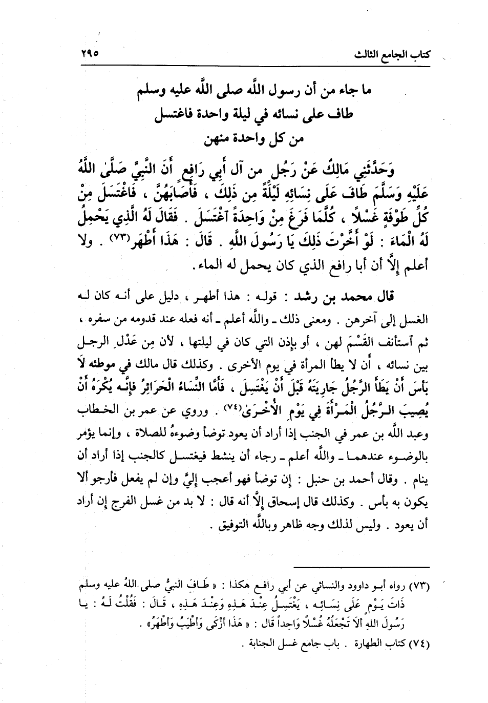من كل واحدة منهن وحدثني مالك عن رجل من آل أبي رافع «أن النبي - صَلَّى اللَّهُ عَلَيْهِ وَسَلَّمَ - طاف على نسائه ليلة من ذلك، فأصابهن، فاغتسل من كل طوفة غسلا، كلما فرغ من واحدة اغتسل. فقال له الذي يحمل له الماء: لو أخرت ذلك يا رسول الله. قال: هذا أطهر» . ولا أعلم إلا أن أبا رافع الذي كان يحمل له الماء.