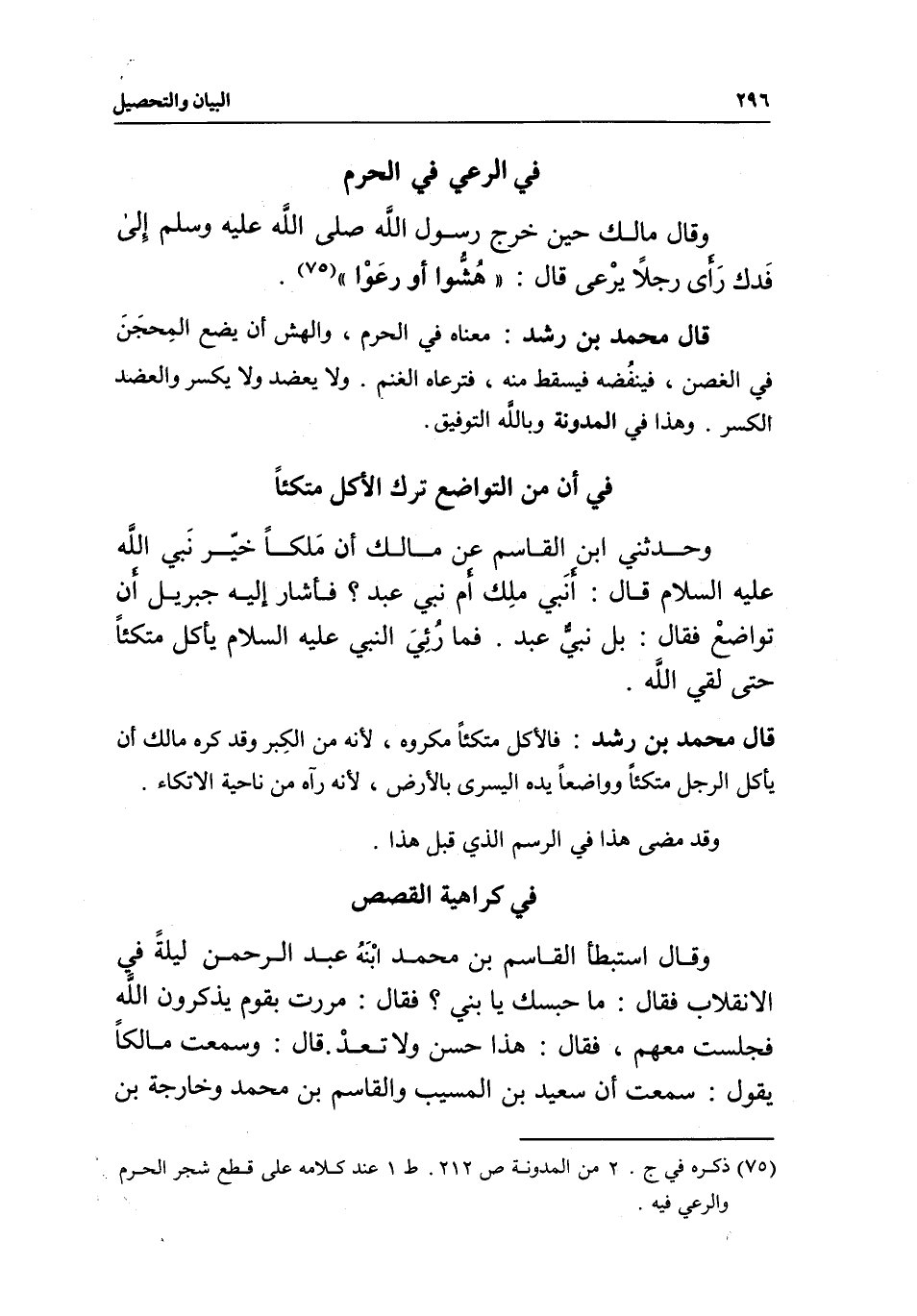 في كراهية القصص وقال استبطأ القاسم بن محمد ابنه عبد الرحمن ليلة في الانقلاب فقال: ما حبسك يا بني؟ فقال: مررت بقوم يذكرون الله فجلست معهم، فقال: هذا حسن ولا تعد. قال: وسمعت مالكا يقول: سمعت أن سعيد بن المسيب والقاسم بن محمد وخارجة بن