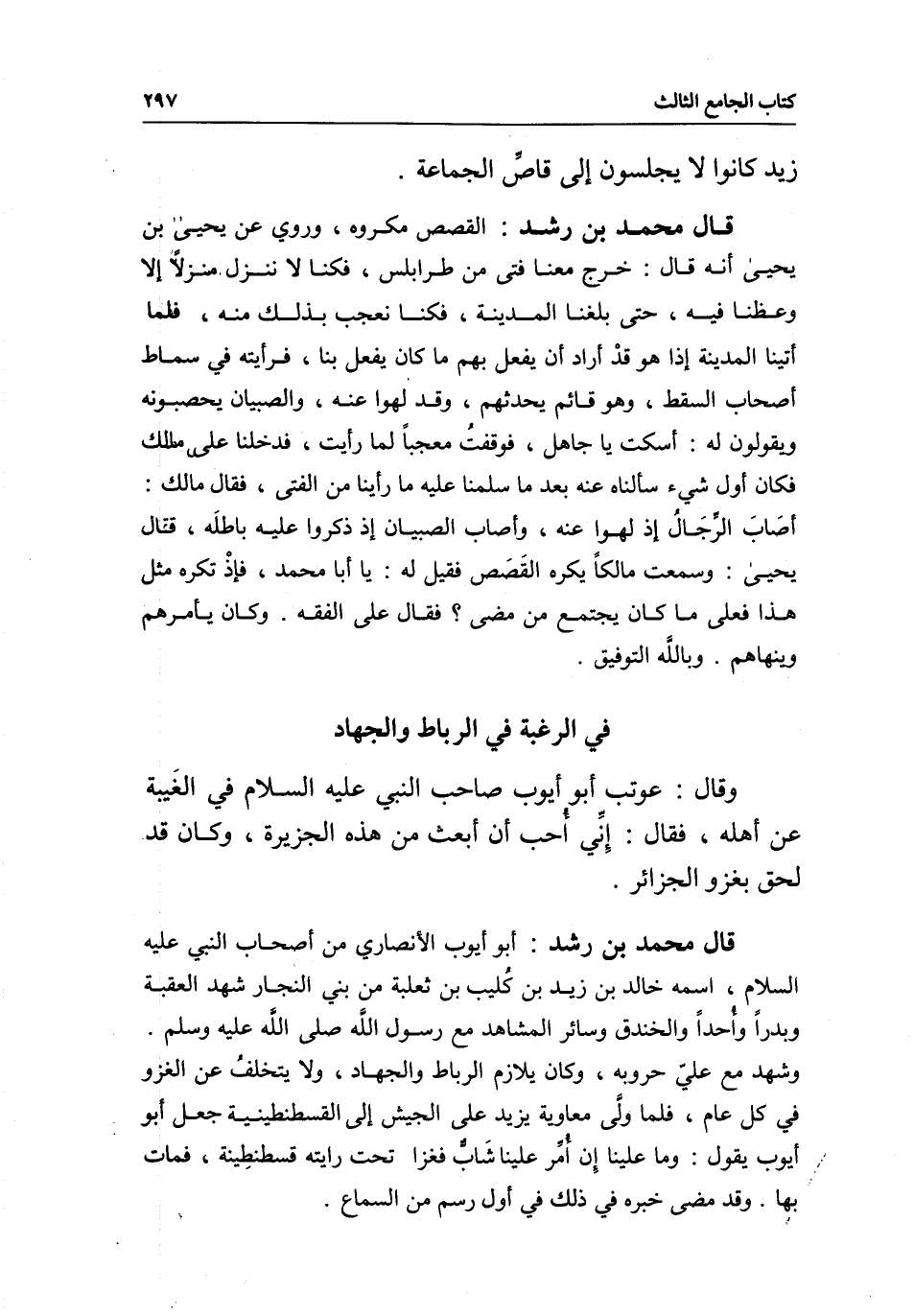 في الرغبة في الرباط والجهاد وقال: عوتب أبو أيوب صاحب النبي - عَلَيْهِ السَّلَامُ - في الغيبة عن أهله، فقال: إني أحب أن أبعث من هذه الجزيرة، وكان قد لحق بغزو الجزائر.